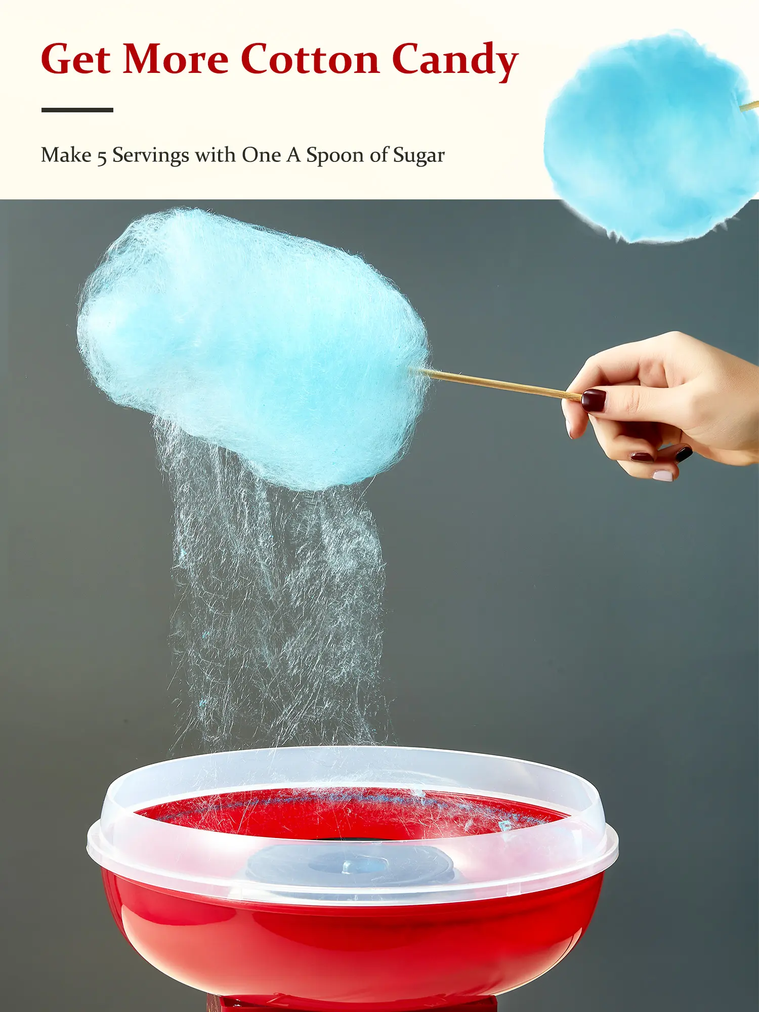 ·Package:1x Cotton Candy Machine1x User Manual1x Plastic Spoon10x Wooden SticksQuartz Double Round Heating TubeThis cotton candy machine kit comes with quartz double round heating tubes, can heat and make cotton candy floss quickly in few minutes.Large Sugar SiloThe candy floss maker's tray size is larger than others, which can better transfer the sugar floss to the cotton swab for easy operation.Splash-Proof TrayThe thoughtful designed splash-proof tray can prevent sugar floss from splashing, a Teflon coated non-stick surface can be rinsed with water or put in the dishwasher for cleaning.Stable Wheels and Non-Slip FeetThis hard candy cotton candy maker machine is a stable and practical machine with a delicate and unique appearance, the cotton candy machine has non-slip feet at the bottom and wheels for added stability.