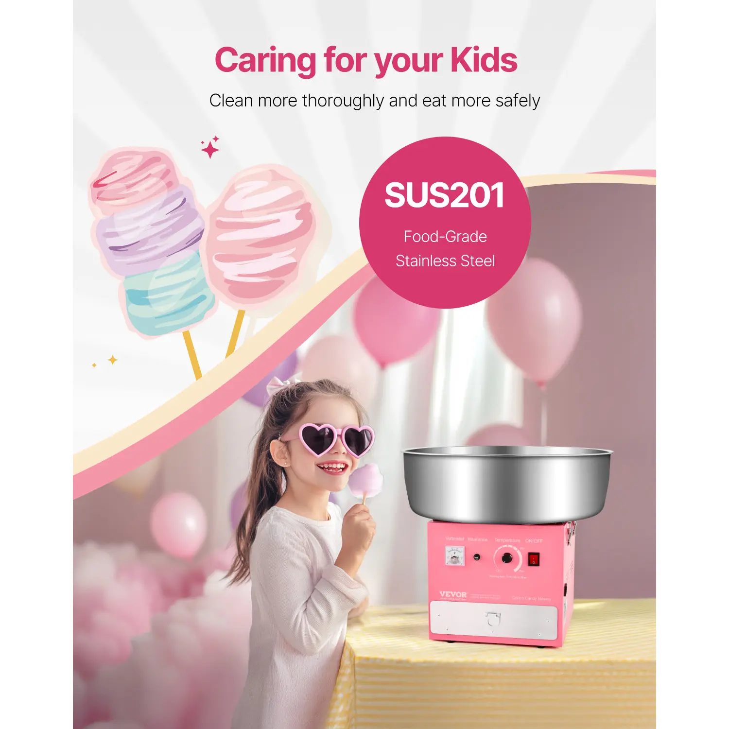• Temp Control: Unlike the common ones, our electric candy floss maker features a voltage meter and a voltage control knob. By changing voltage, you can simply adjust the temperature. If you want to try different flavored sugars, you will absolutely need this