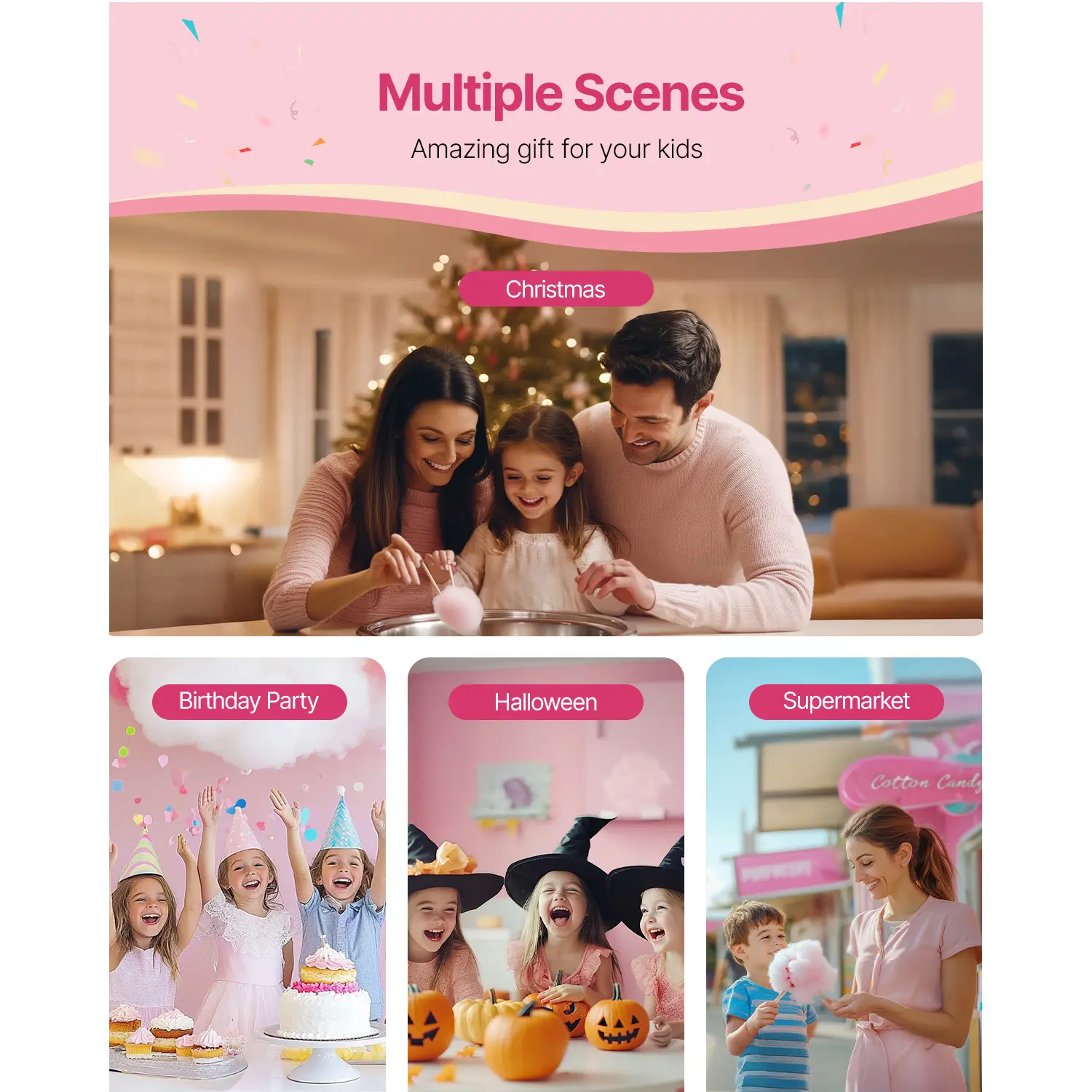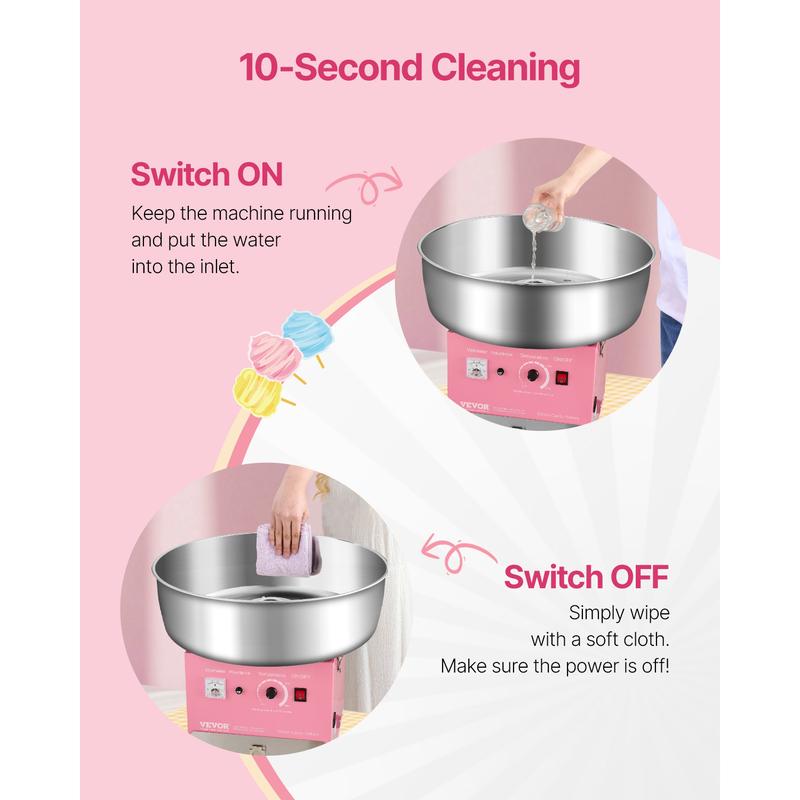 • Work with Any Candy You Like: This cotton machine allows you to use the traditional flossing sugars, milk sugars, fruit cubes, or any of your favorite hard candies to make delicious cotton candies. With a compact size, it is suitable for countertop use, and it is perfect for carnivals, festivals, birthday parties, and sports events