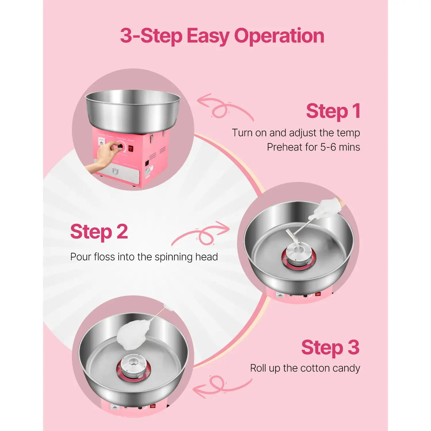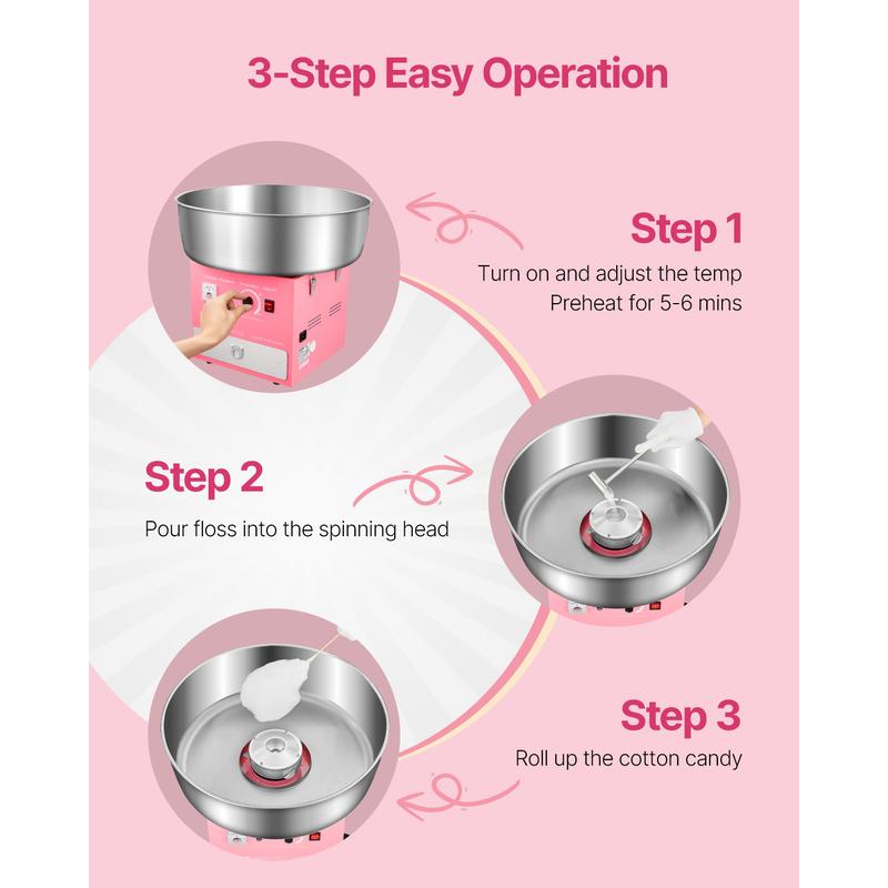 • Easy-Operating Process: Using this machine couldn't be easier. Turn on the power, adjust the voltage, warm up for 2-3 minutes, and pour sugar into the spinning head, and then you just need to use the sticks to collect the cotton candies from the head. Even for the first time, it's easy to make a perfect cotton candy