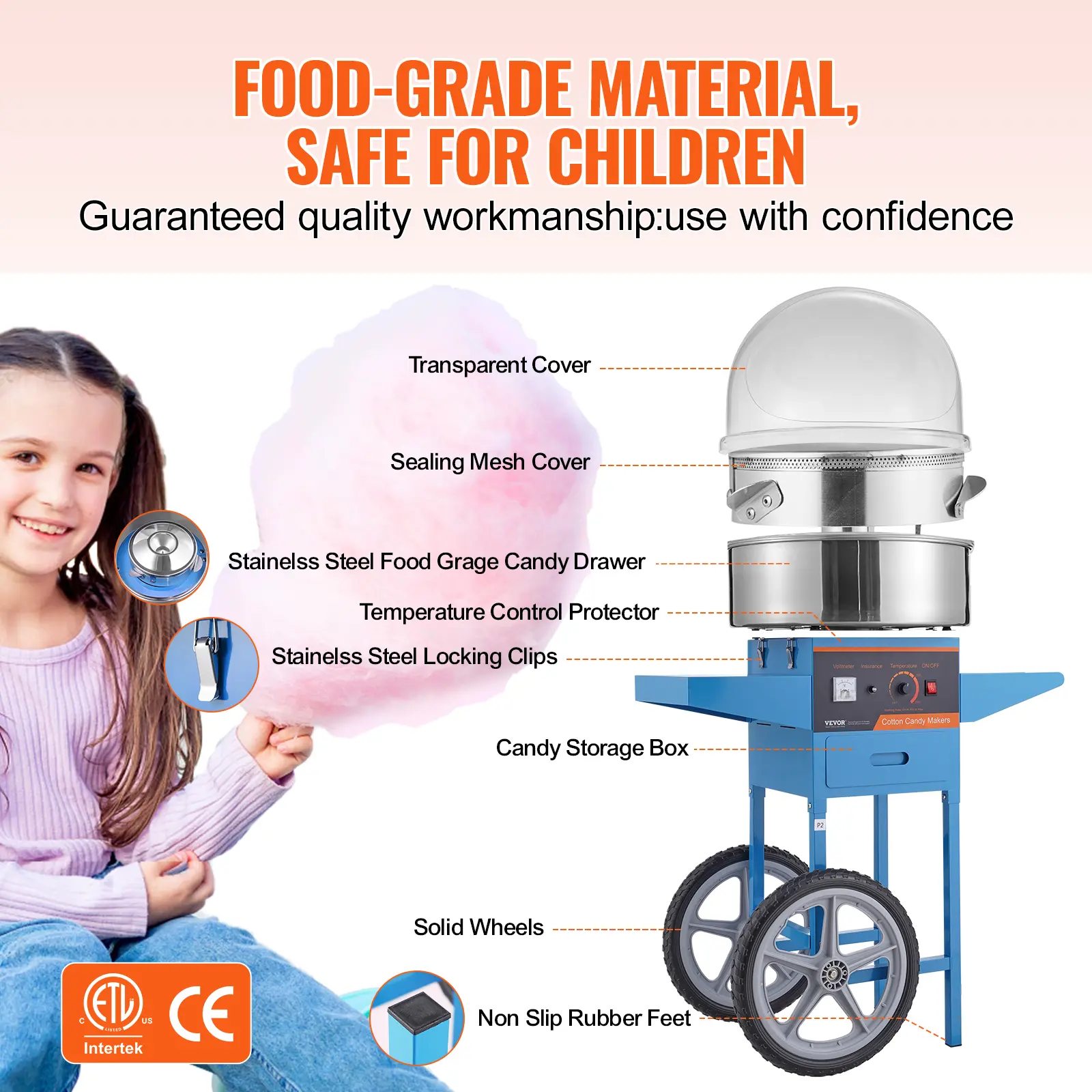 • User-Friendly Designs: This candy floss maker is equipped with a candy box, which helps provide extra storage space for cotton candy cones/sticks or floss sugar packs; The sugar spoon as an extra offering is convenient for you to scoop and pour sugar; The sealing treatment components can prevent sugar flocs falling into gaps. The transparent cover can prevent external objects from drifting into the cotton candy. Besides, ETL/CE certification ensures greater safety during use.