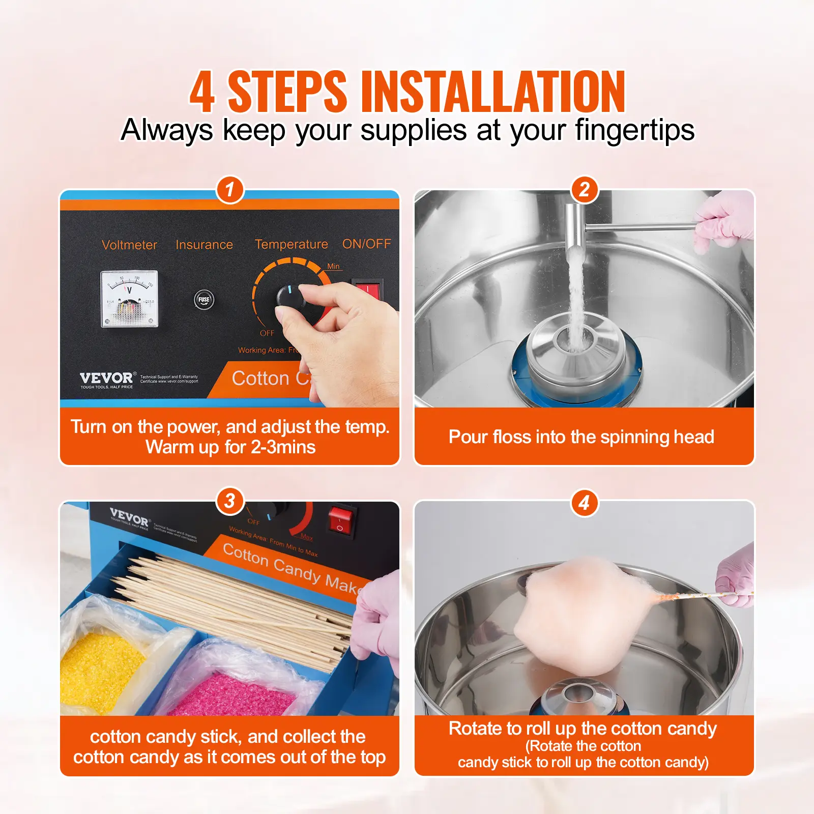 • Easy-Operating Process: Using this machine couldn't be easier. Turn on the power, adjust the temperature, warm up for 2-3 minutes, and pour sugar into the spinning head, and then you just need to use the sticks to collect the cotton candies from the head.
