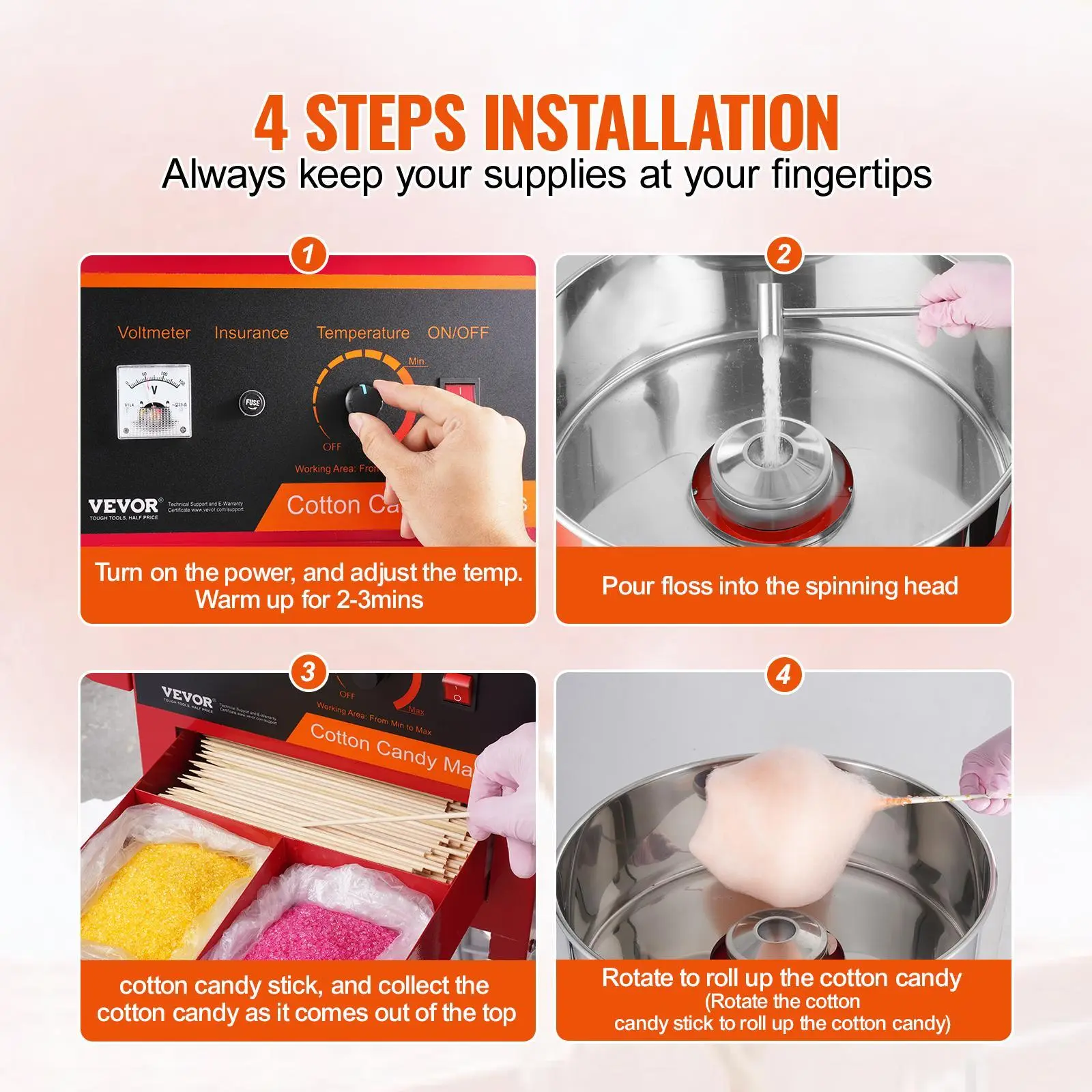 • Easy-Operating Process: Using this machine couldn't be easier. Turn on the power, adjust the temperature, warm up for 2-3 minutes, and pour sugar into the spinning head, and then you just need to use the sticks to collect the cotton candies from the head.