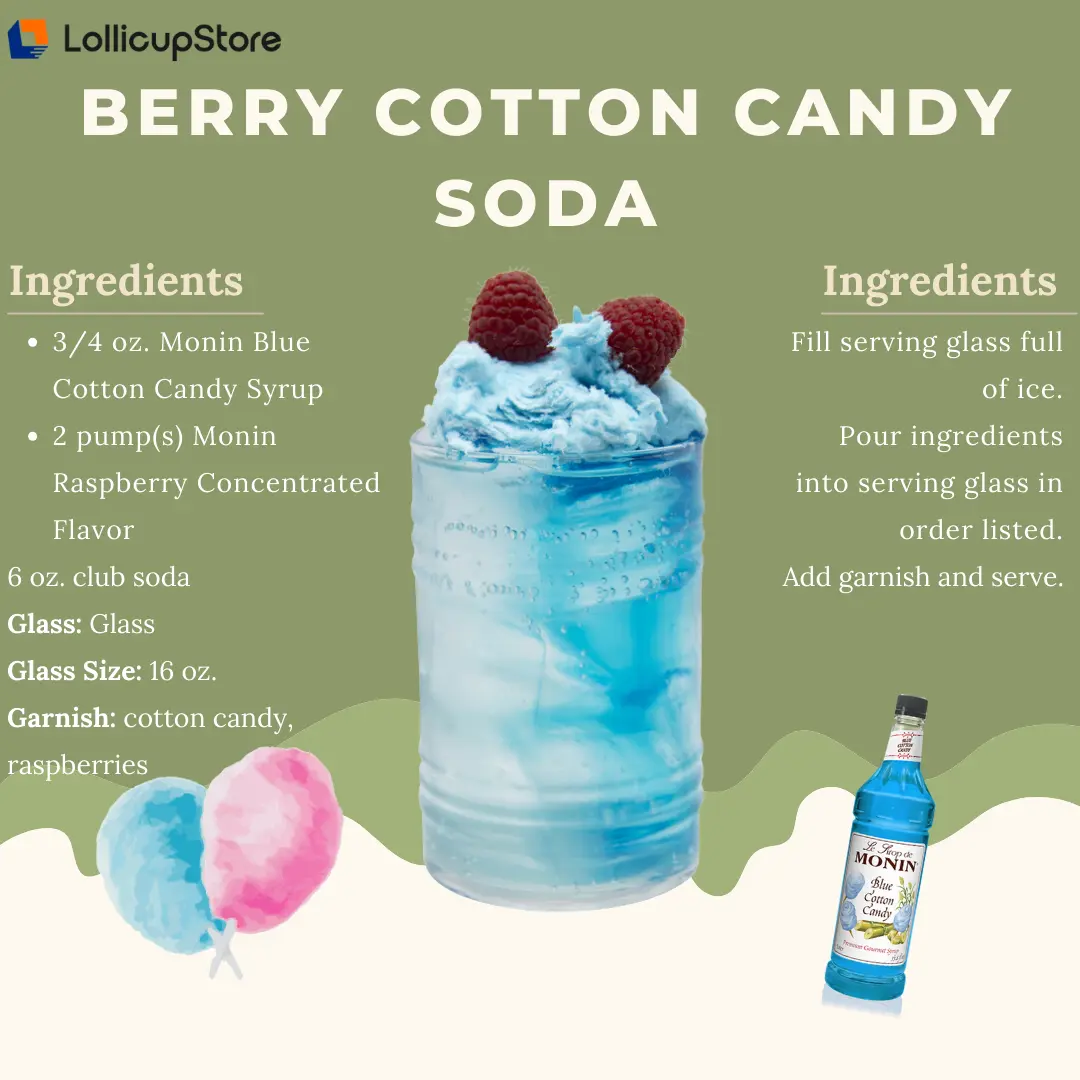 The kid-friendly flavor of cotton candy is captured in Monin Blue Cotton Candy Syrup. This flavored syrup delivers the taste and aroma of freshly spun cotton candy! Add some to a milkshake or soda water for a tastey treat everyone can enjoy. Or pour a little nostalgia into your adult beverage. The syrup is colored with natural ingredients.