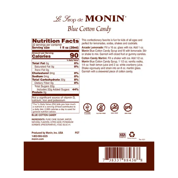 Cotton candy's airy, fluffy texture and melt-in-your-mouth sensation are major factors in its flavor and popularity for kids of all ages. Monin Blue Cotton Candy Syrup bottles the taste and aroma of freshly spun cotton candy. Made with select ingredients and pure cane sugar, Monin Blue Cotton Candy Flavored Syrup is a highly concentrated, authentic flavoring offering exceptional versatility for creating specialty beverages.
