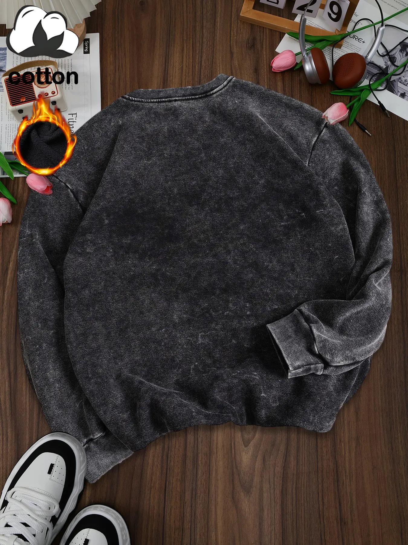 This cotton fleece sweatshirt is soft ,warm , and very comfortable,This inside fleece feels cozy without being too heavy,making it perfect for everyday wear ,workouts ,or just relaxing.The fit is causal but flattering ,and it’s doesn’t feel bulky at all.