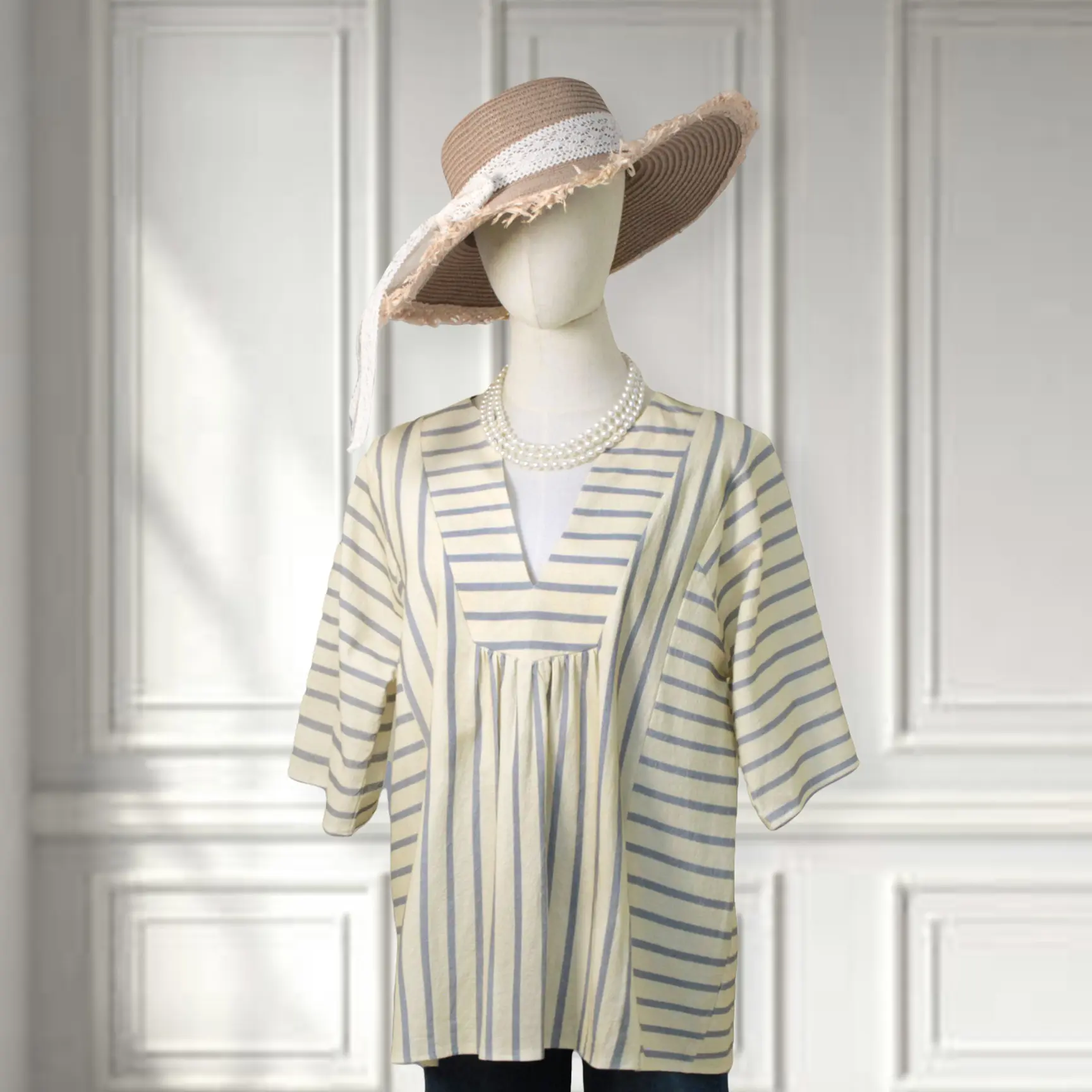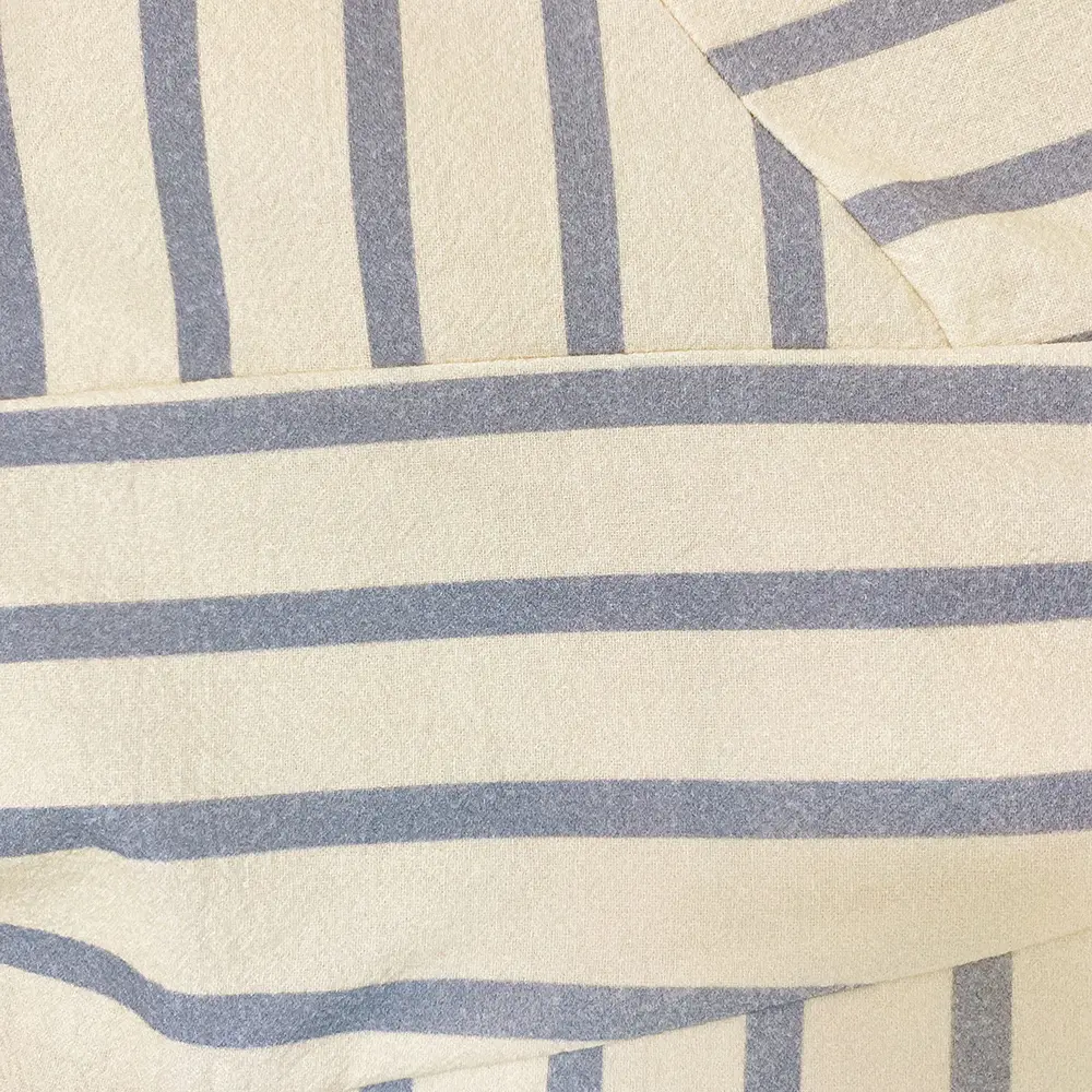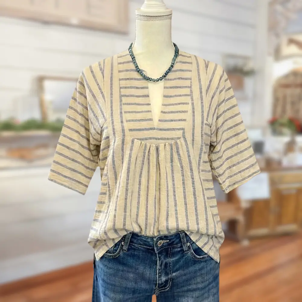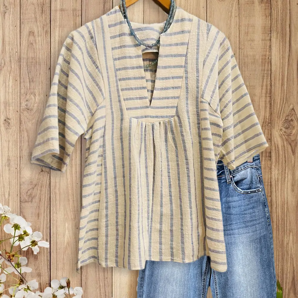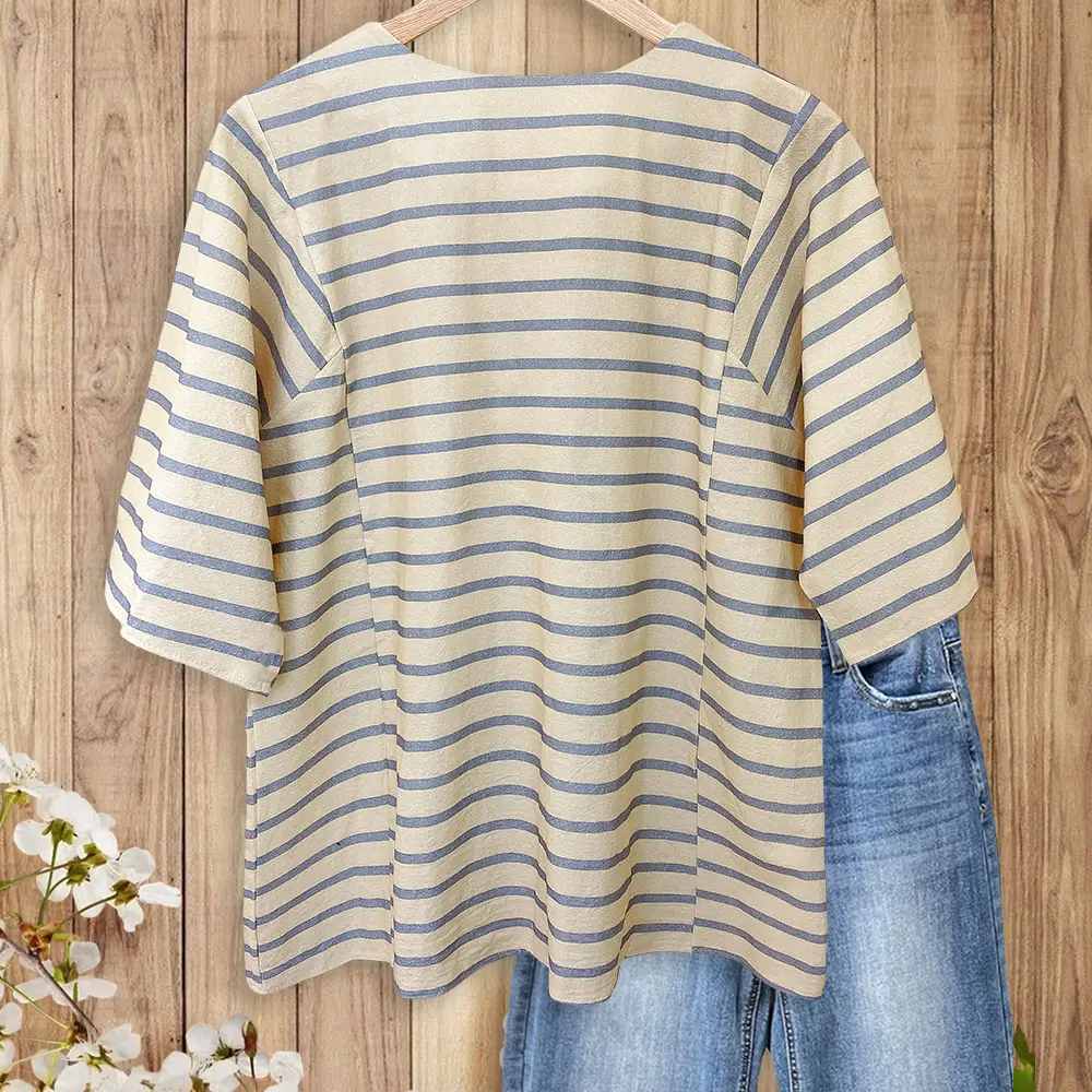 · Vertical beige and mist blue stripes create a slimming silhouette, accented by strategic horizontal stripes at the V-neck and waist for visual interest.