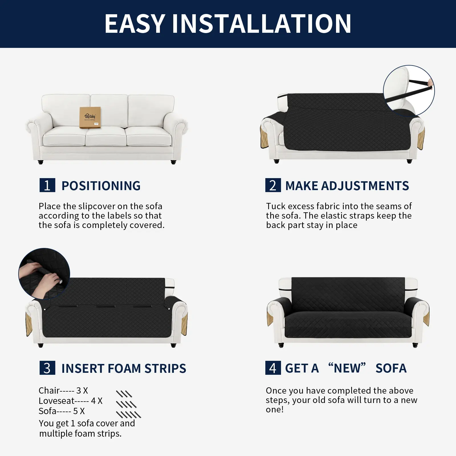 Just drape it on, tuck any extra fabric into the gap/crease. Two foam pipes, which tucked into the grooves on two sides to stay in place better. The back of the sofa is fitted with elastic.