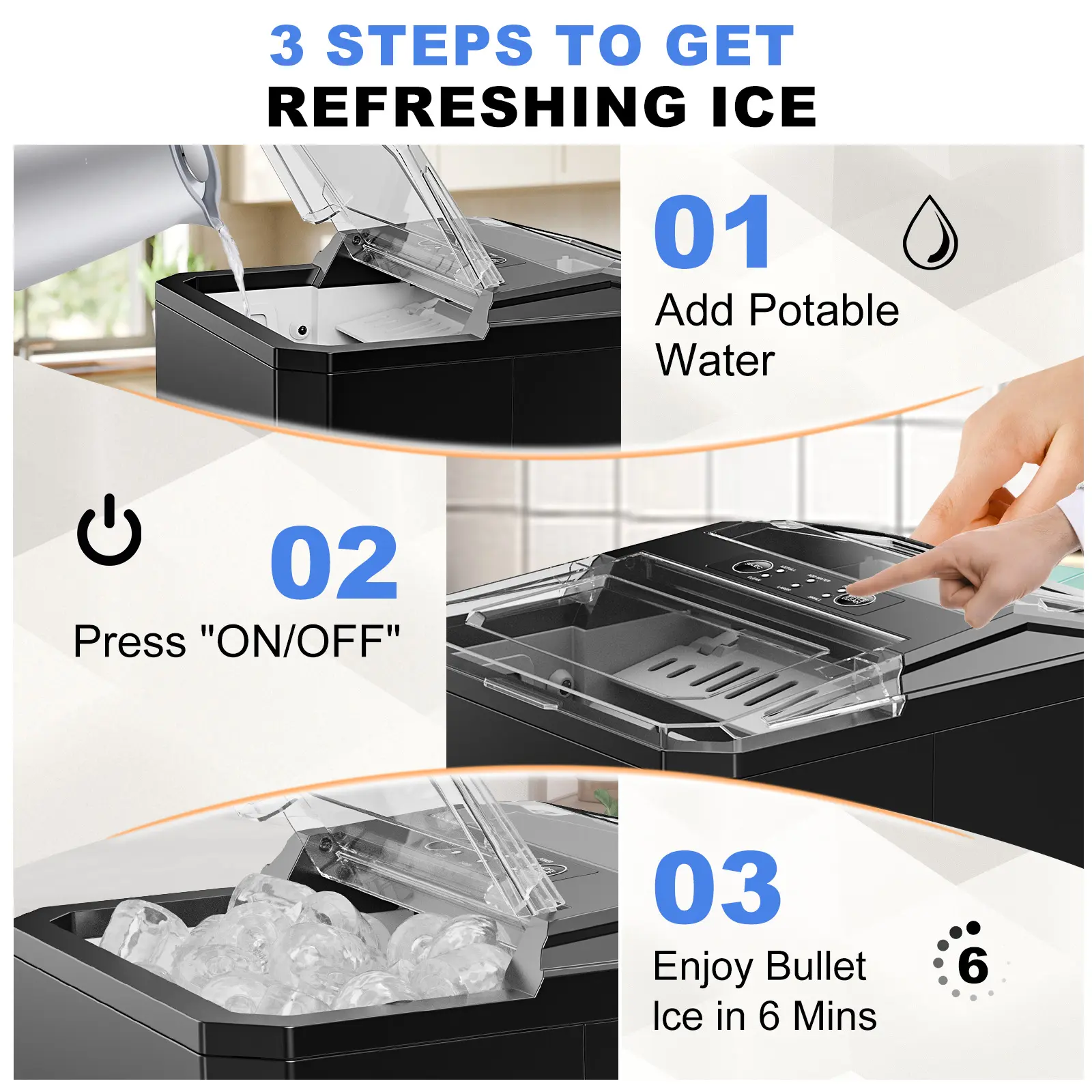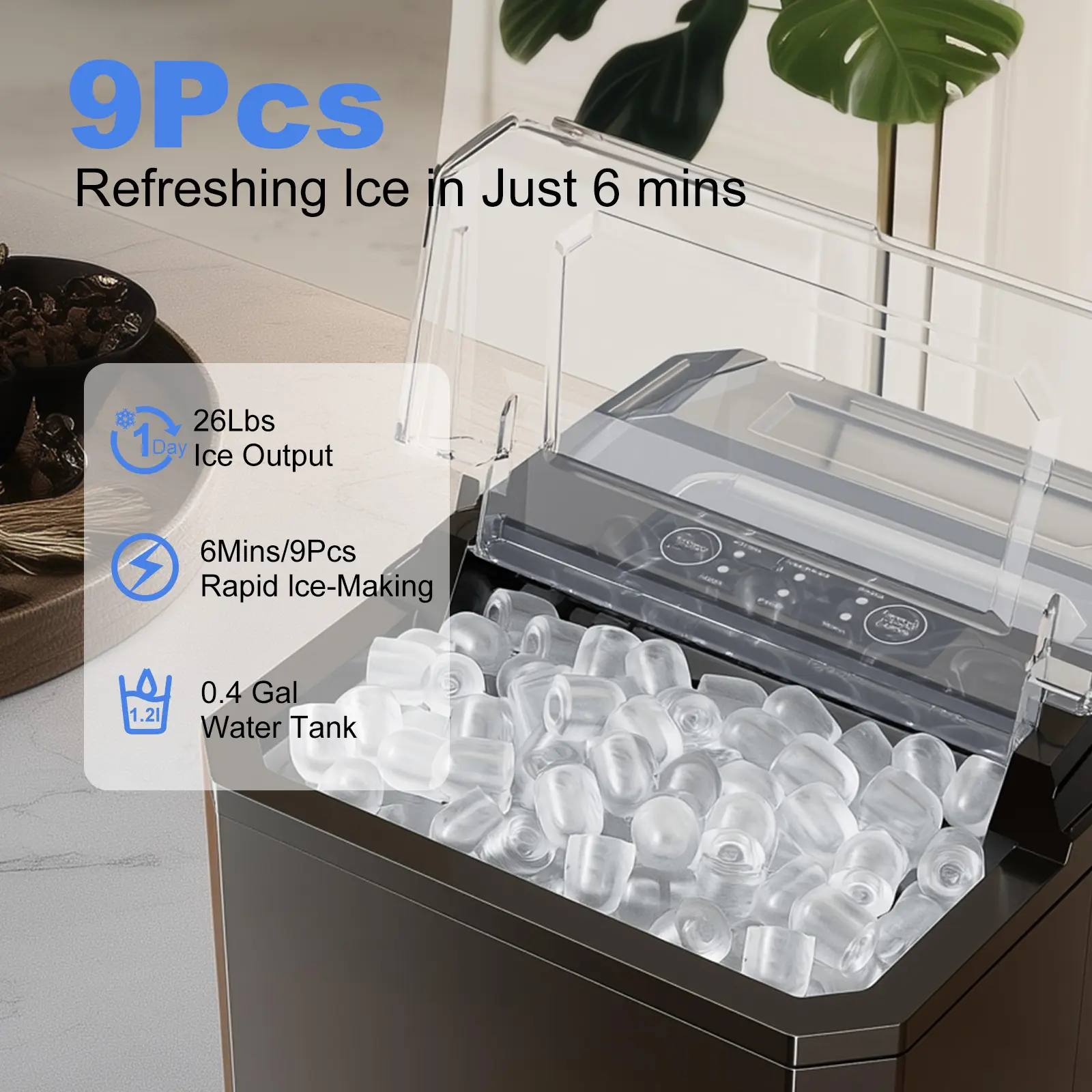 ·【FAST ICE MAKING】The ice maker can make 9 bullet-shaped ice cubes in just 6 minutes. Fill 1.5L of water into the water tank, maximum ice capacity can reach 26.5 pounds in 24 hours. Say goodbye to long waiting times and enjoy a constant supply of ice whenever you need it. It has a transparent window, so you can watch the ice being made.
