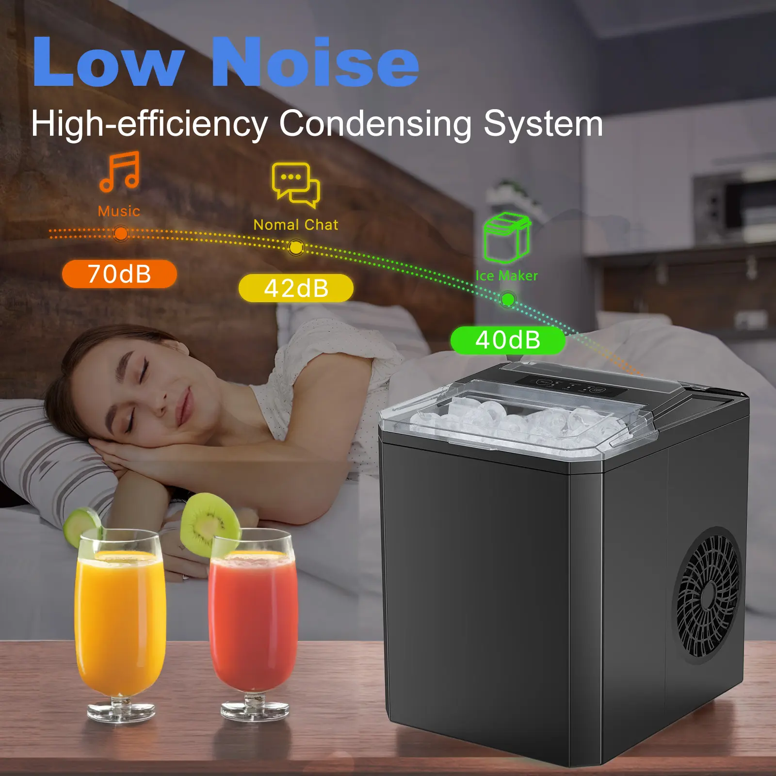 ·【SMART & SIMPLE OPERATION】The control panel is very easy to operate. Enjoy fresh ice with 3 easy steps! When the water is insufficient or the ice basket is full, the indicator light will turn on. When making ice cubes, the noise is lower than 40dB, similar to a working refrigerator.