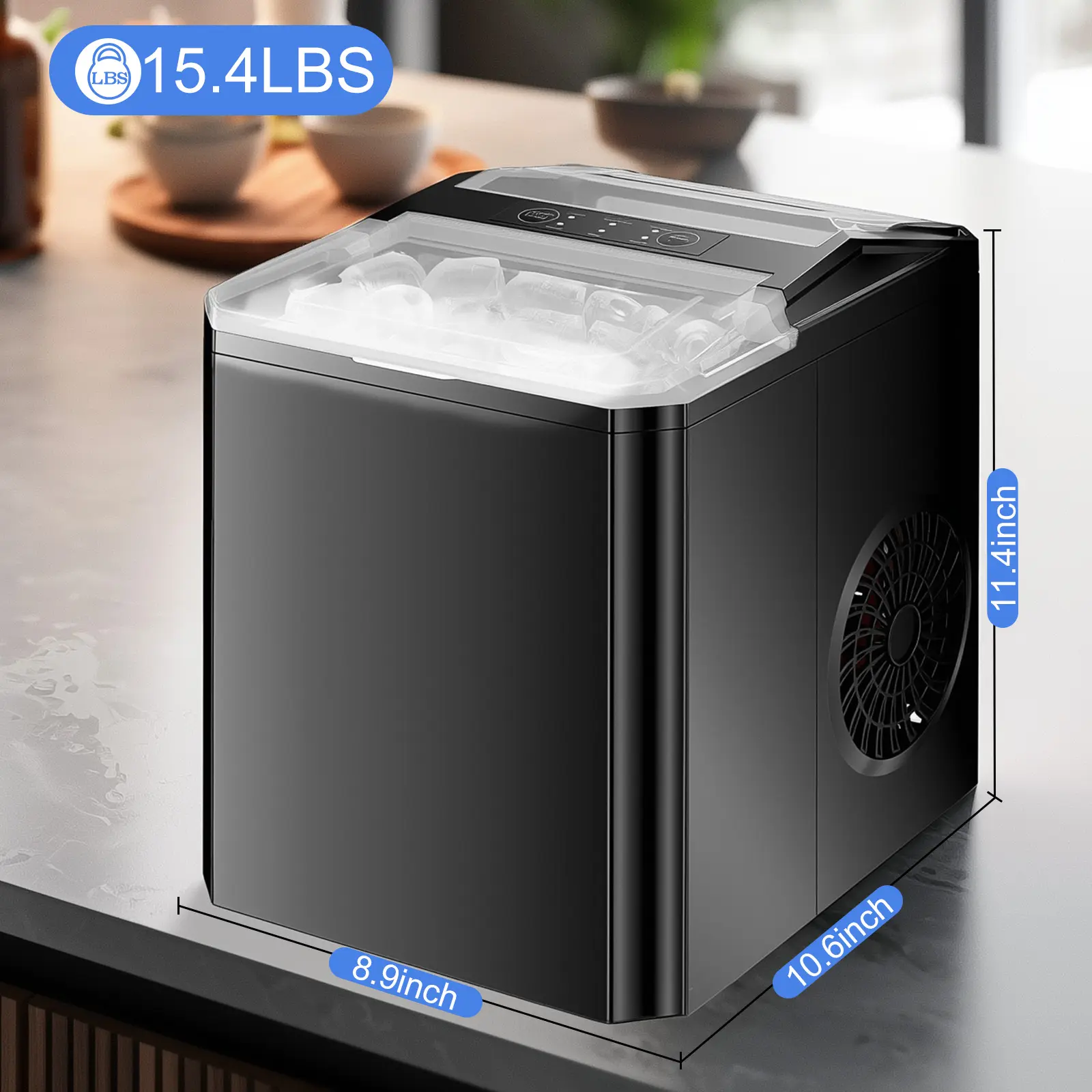 ·【PORTABLE ICE MAKER】This counter top ice machine maker weighs 15.4 pounds and is designed with a convenient carry handle. The small ice maker measures 8.8*11.6*12.5 inches. You can place the mini portable ice maker countertop anywhere, perfect for the kitchen, office, bar, camping, RV, or parties.