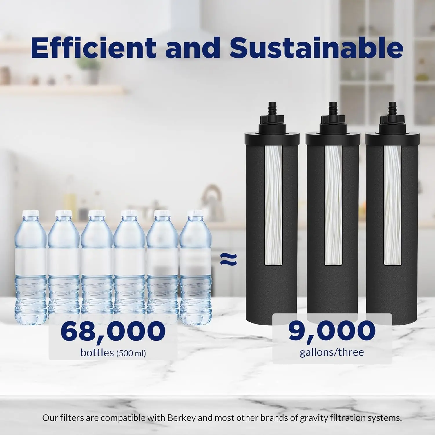 Efficient and Sustainable - Gravity water filter system with a capacity of 2.25 gallons. - Three filters produce water simultaneously, offering a flow rate 1.5 times faster than systems with only two filters. - Produces up to 9,000 gallons of water, ensuring over 3 years of service for a family of four, saving up to 68,000 plastic bottles (500ml).
