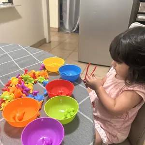 This was a birthday gift for my two year old granddaughter and she absolutely loves them!! She plays with them multiple times a day; sorting, counting , she scoops them with the bowls, and more. They are small so she is always supervised. Definitely a great purchase!