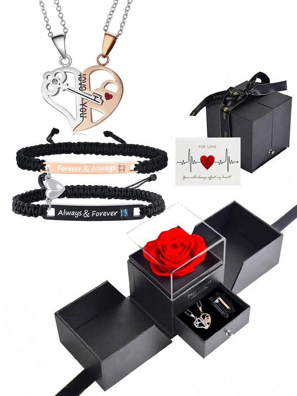 Valentine's Day Couple Jewelry Set with Rose Box, Including Rhinestones Decor Pendant Necklace & Heart Charm Bracelet, Adjustable Jewelry Set for Men & Women, Gift for Couple, Jewellery Gift Set, Mother's Day Gifts, Gift Set for Mothers, Gifts for Her
