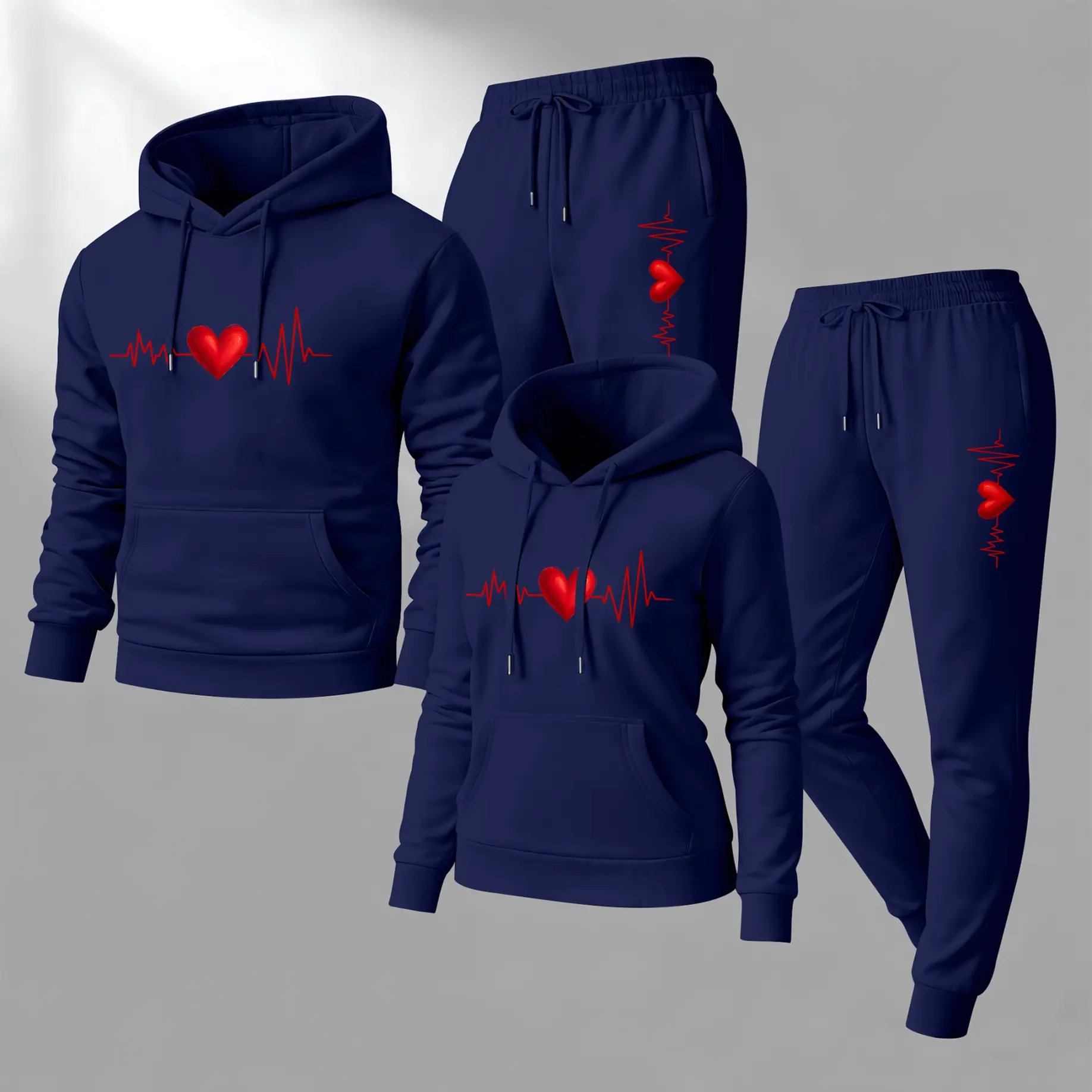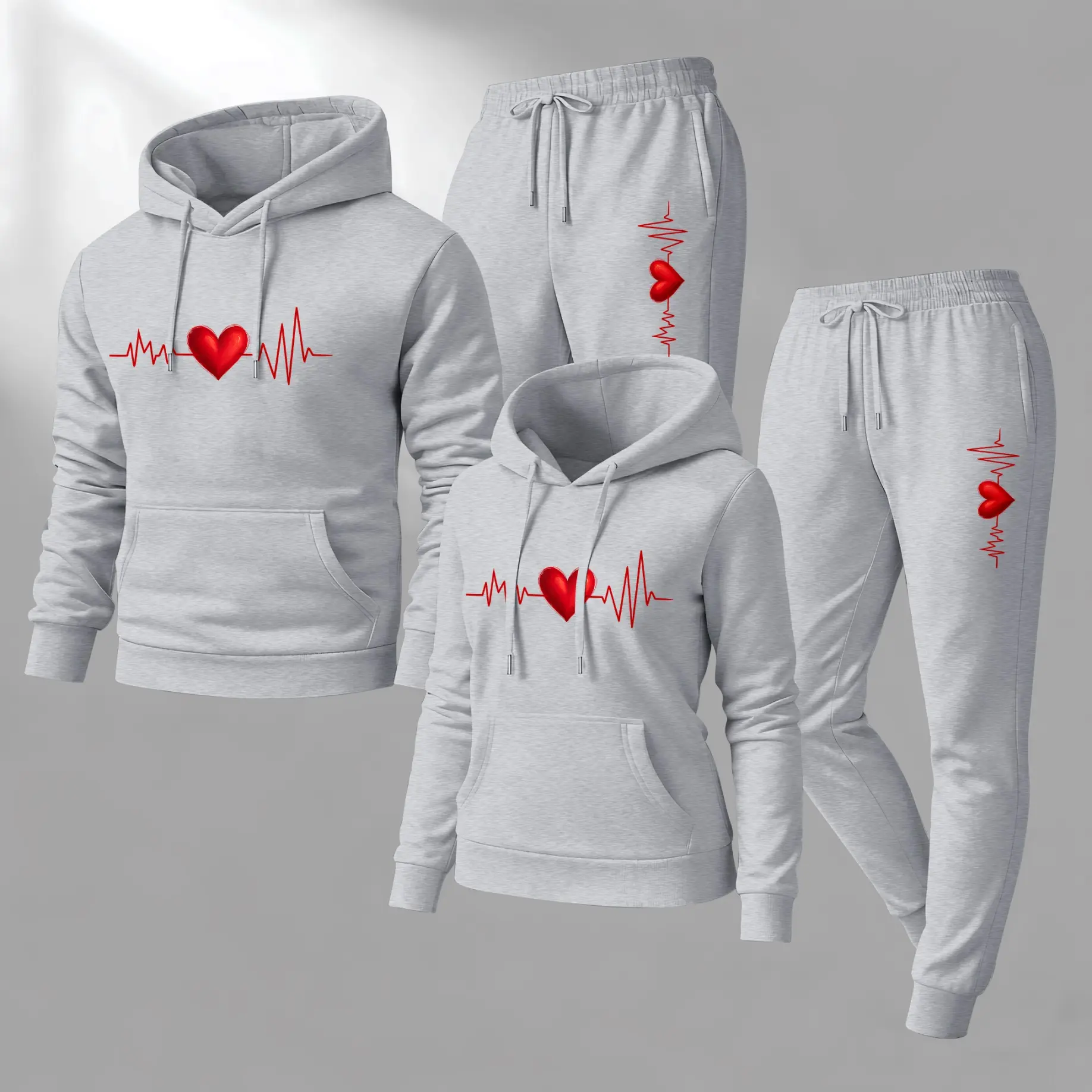 5. Couple's Heartbeat Print Hooded Sweatshirt and Drawstring Sweatpants Set, Casual Sportswear, Long-Sleeve Hooded Jacket and Pants, Suitable for Autumn, Winter, and Spring, Everyday Wear, Tracksuit, Casual Athletic Wear
