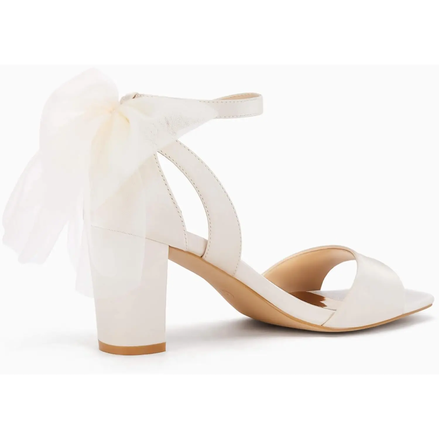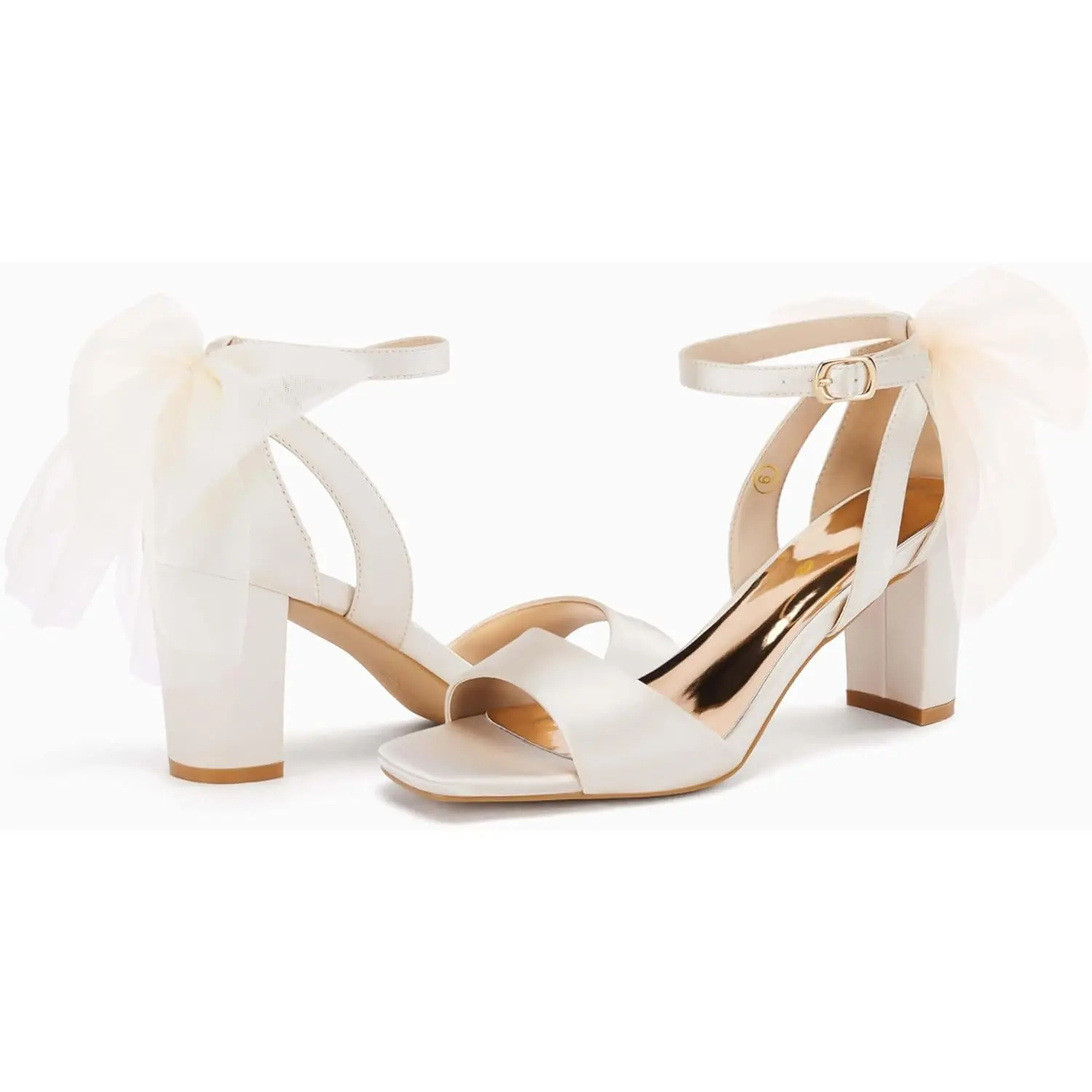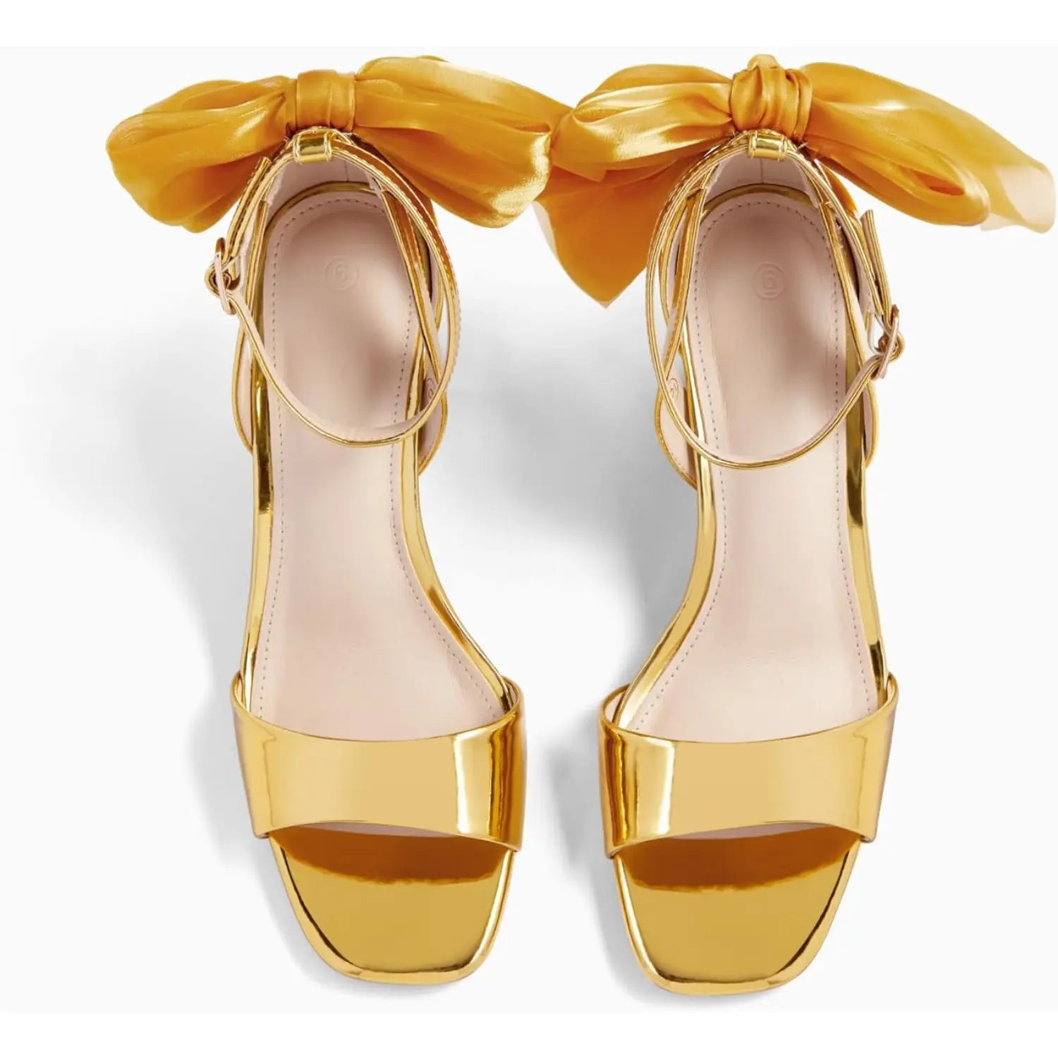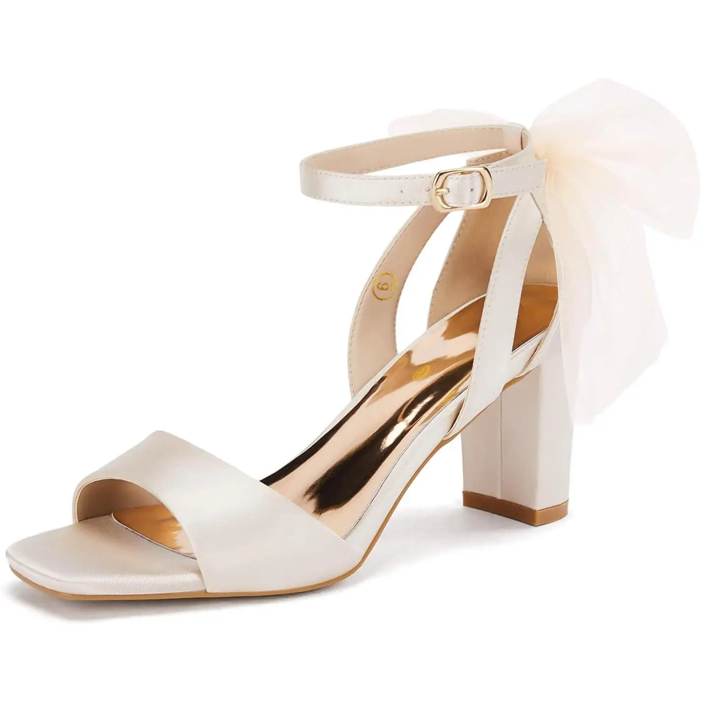 5. Coutgo Women's Bow Tie Heeled Sandals Chunky Heels One Strap Satin Ankle Buckle Dress Wedding Shoes