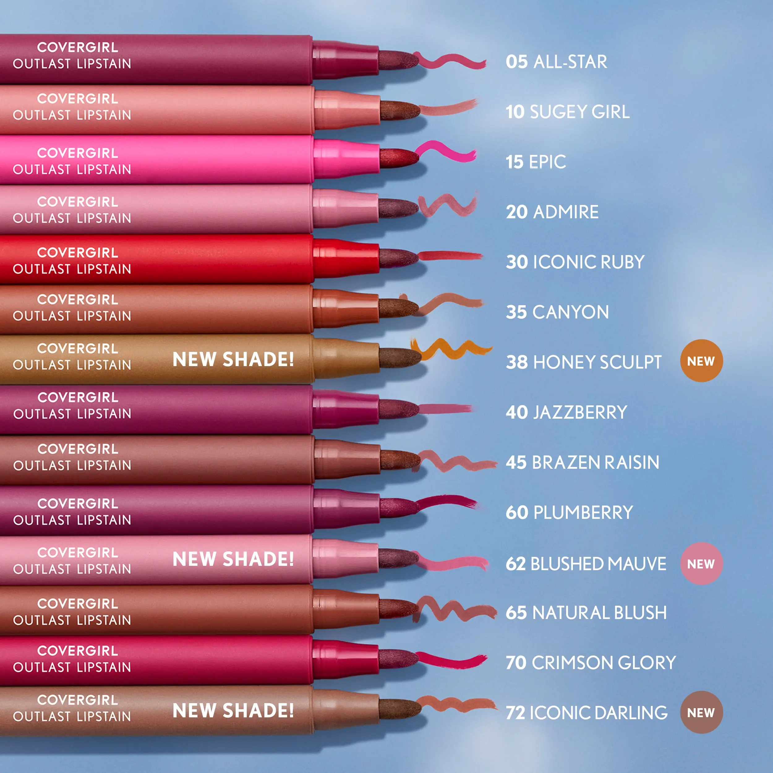 3 NEW Shades Now Available: COVERGIRL’s viral Outlast Lipstain expands with new lip-lining, contour shades. You asked, we delivered—now available in additional warm-toned browns and pinks specifically developed to help shape your lips.