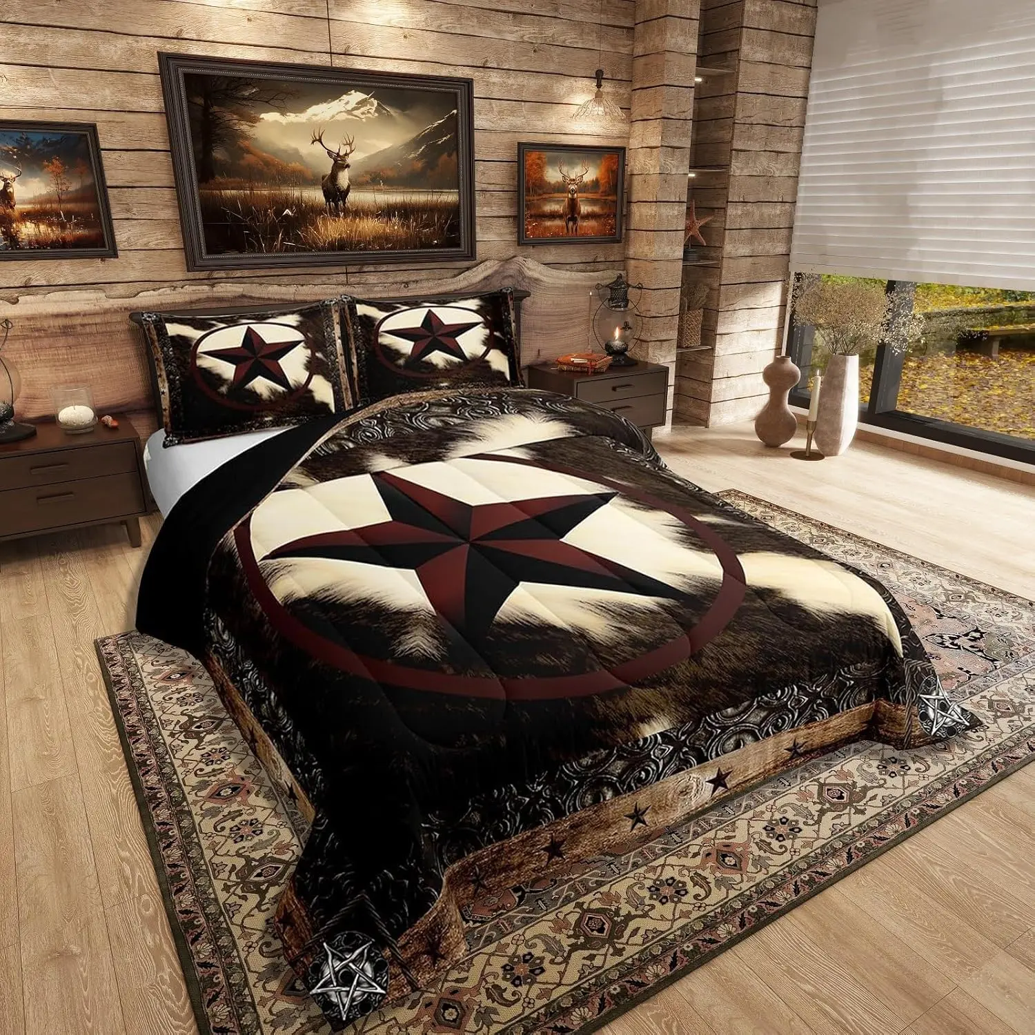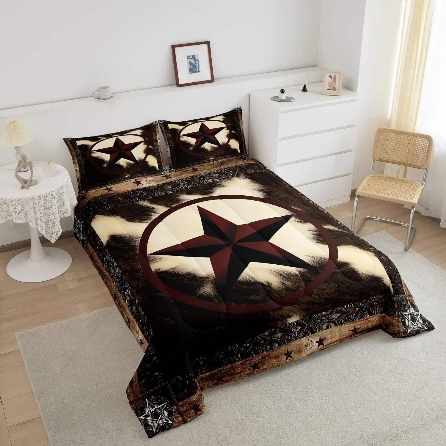 Cow Print Bedding Set,Retro Cowhide Comforter Set for Kids Teens,Adult,Geometric Western Texas Stars Print Duvet Insert Lightweight
