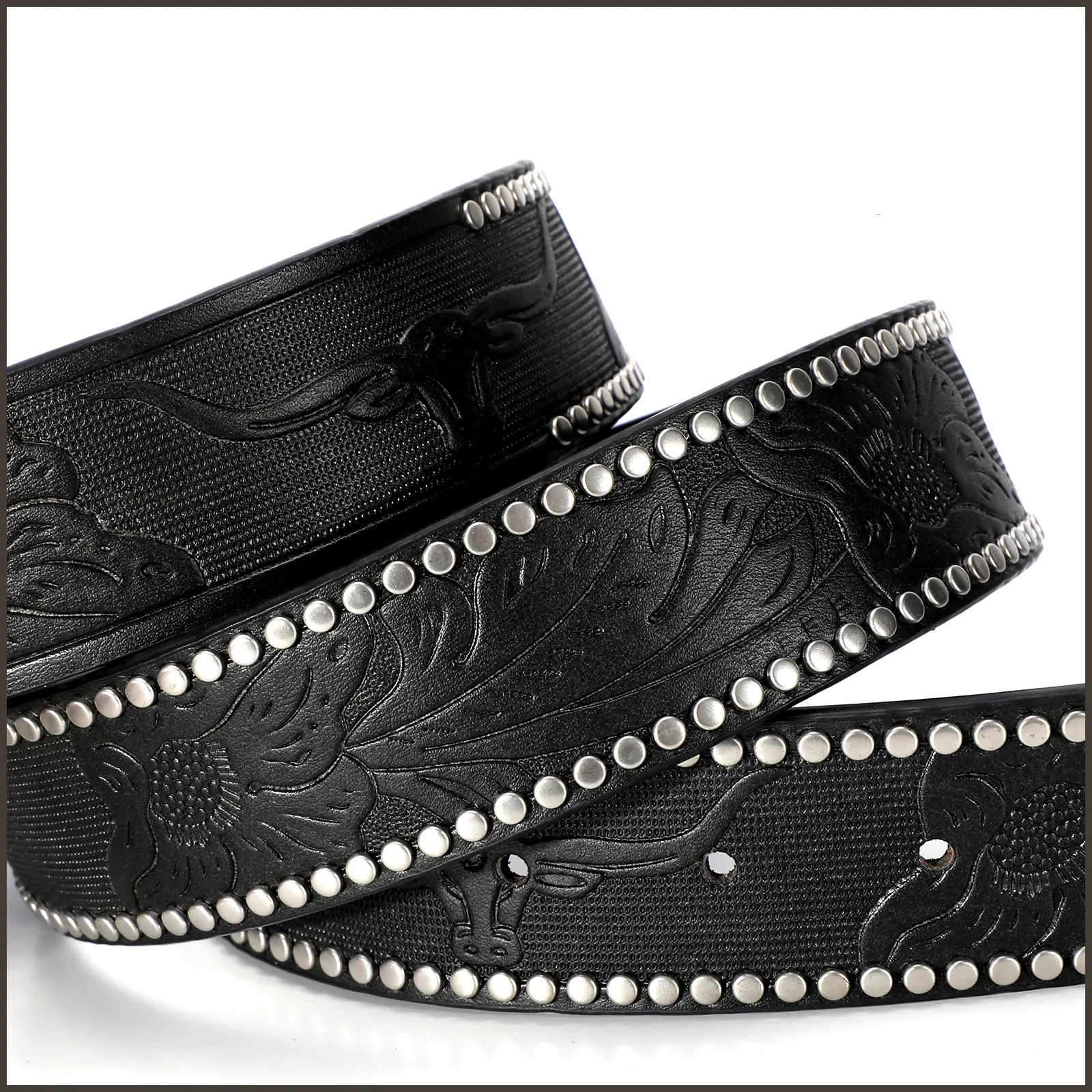 5. XZQTIVE Western Cowboy Cowgirl Belt for Men and Women Engraved Floral Longhorn Bull Cow Skull Western Leather Buckle Belt for Men Women Floral Engraved Cowboy Belt for Jeans Longhorn Bull Buckle Waist Belt,L Western Brown Leather Print Belt with Buckle