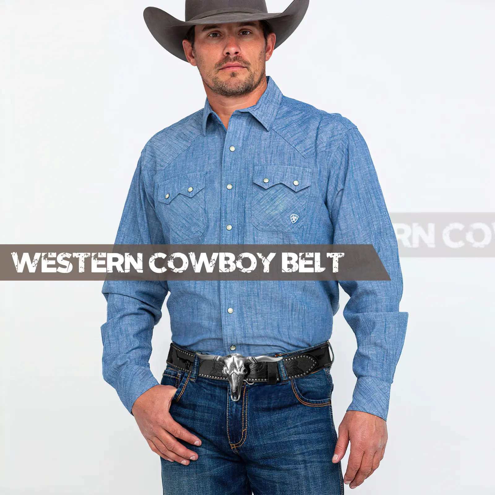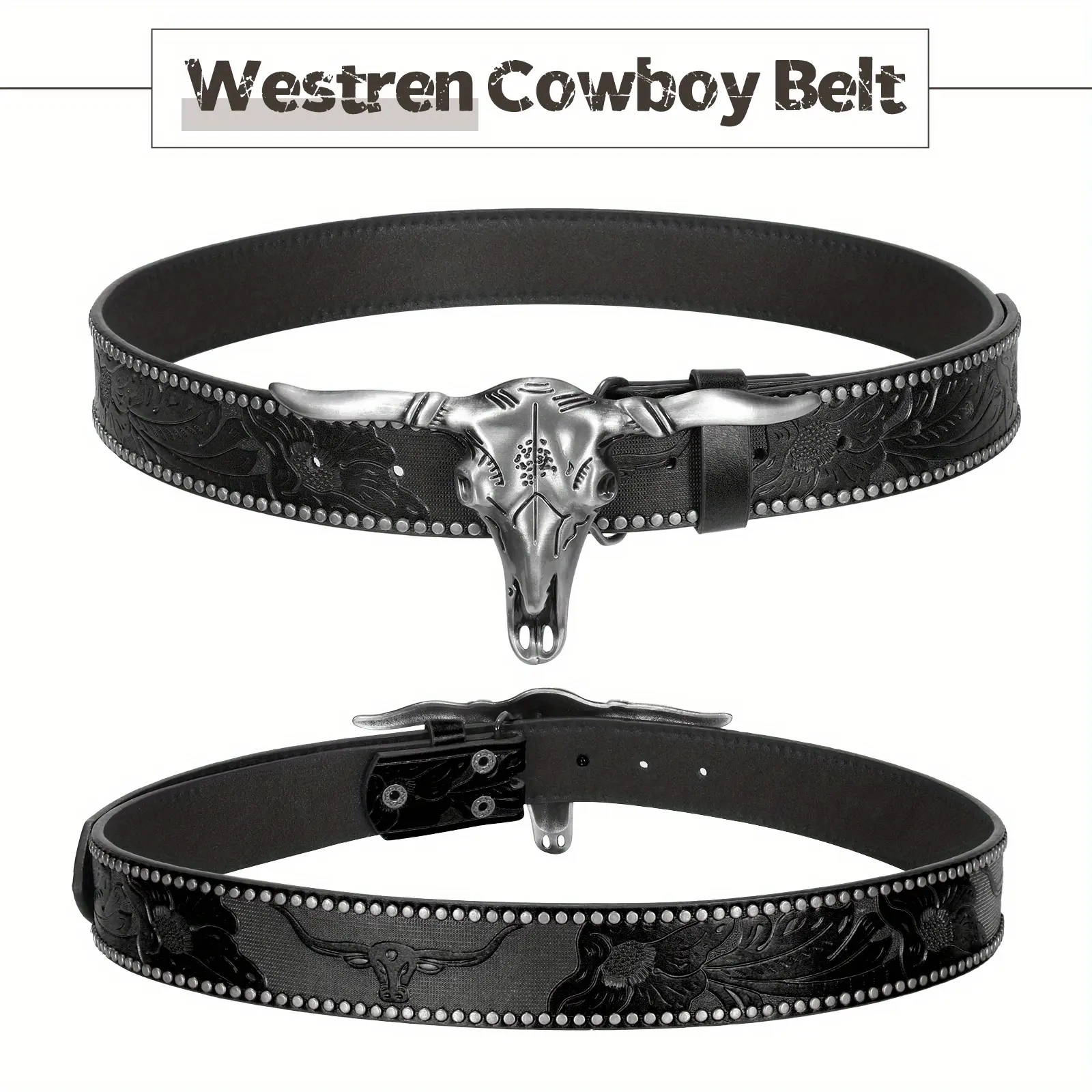 XZQTIVE Western Cowboy Cowgirl Belt for Men and Women Engraved Floral Longhorn Bull Cow Skull Western Leather Buckle Belt for Men Women Floral Engraved Cowboy Belt for Jeans Longhorn Bull Buckle Waist Belt,L Western Brown Leather Print Belt with Buckle