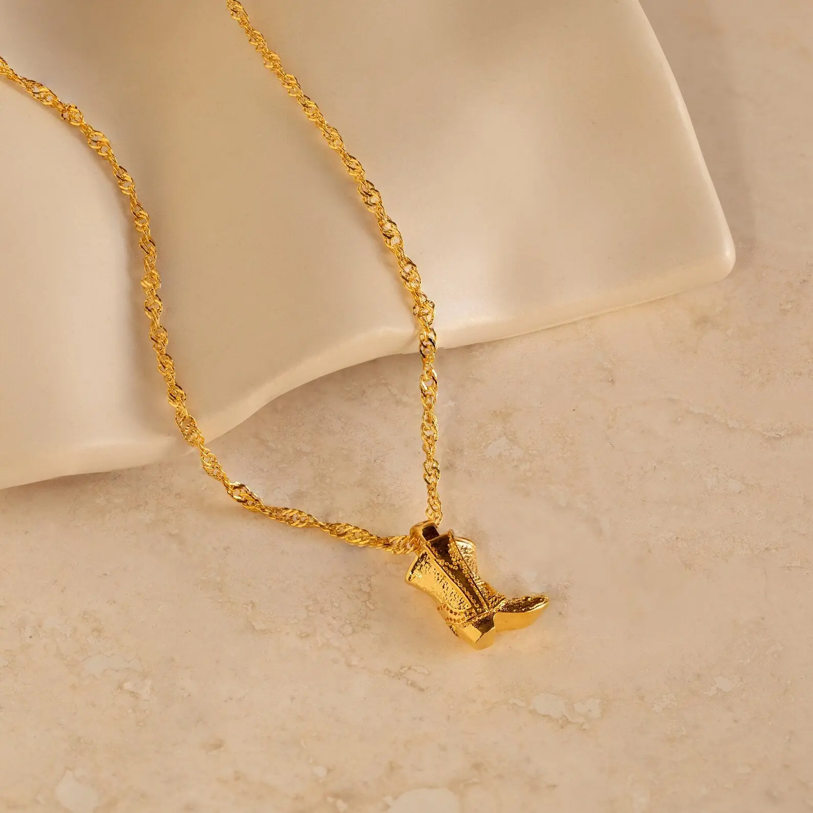 Western style is alive and well with our Cowboy Boot Necklace. The detailed engraved cowboy boot pendant hangs delicately on a minimalist twisted chain, easy to layer with other necklaces in your collection. From a music festival to a bachelorette party, this unique necklace is perfect to accompany you on all your adventures.