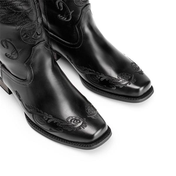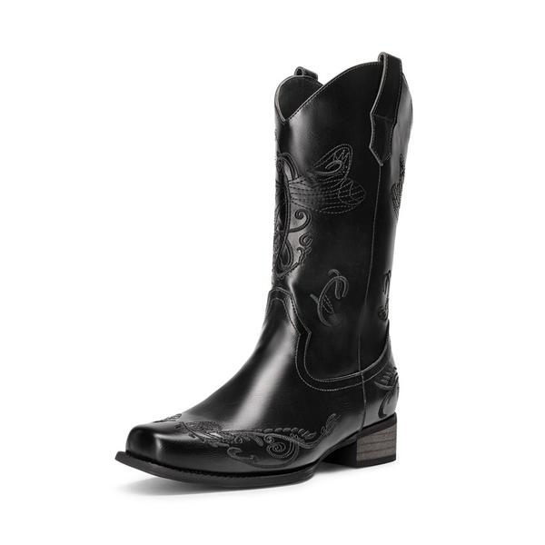 Boasting a western-inspired design, a square toe, and an embroidery pattern, these boots are anything but boring. They are an ideal choice to match your western style outfits. Available in black and white.