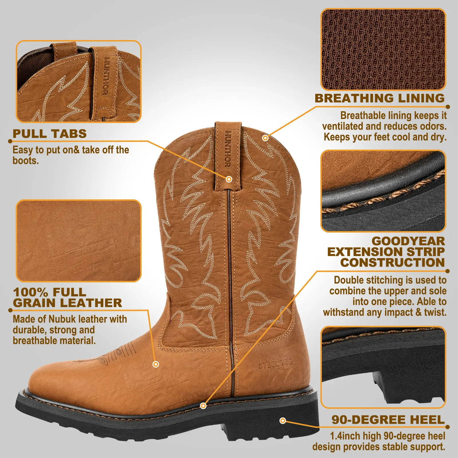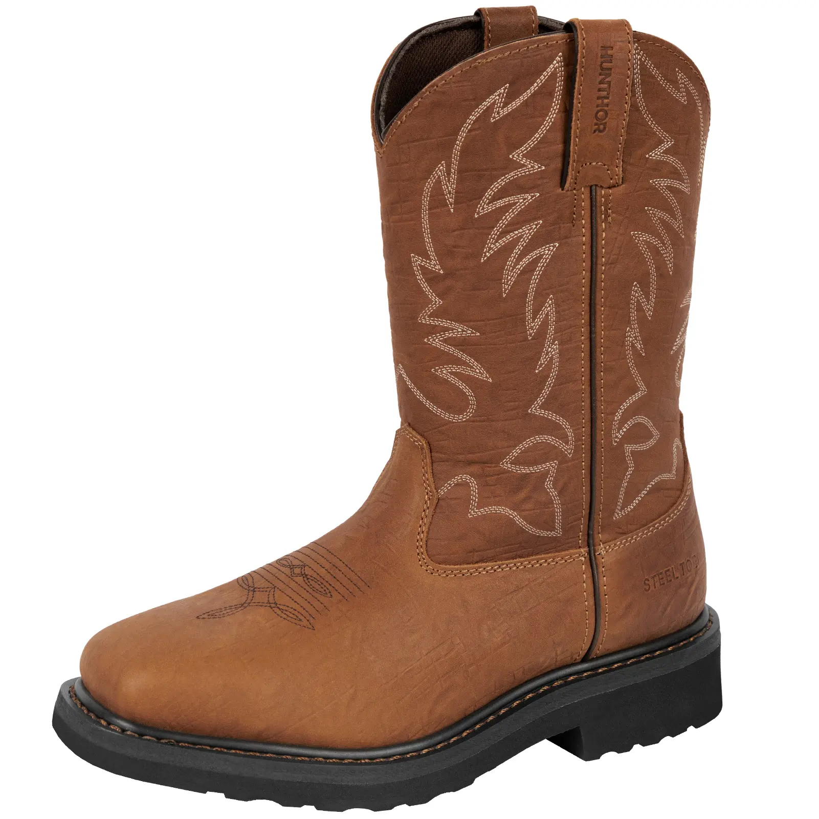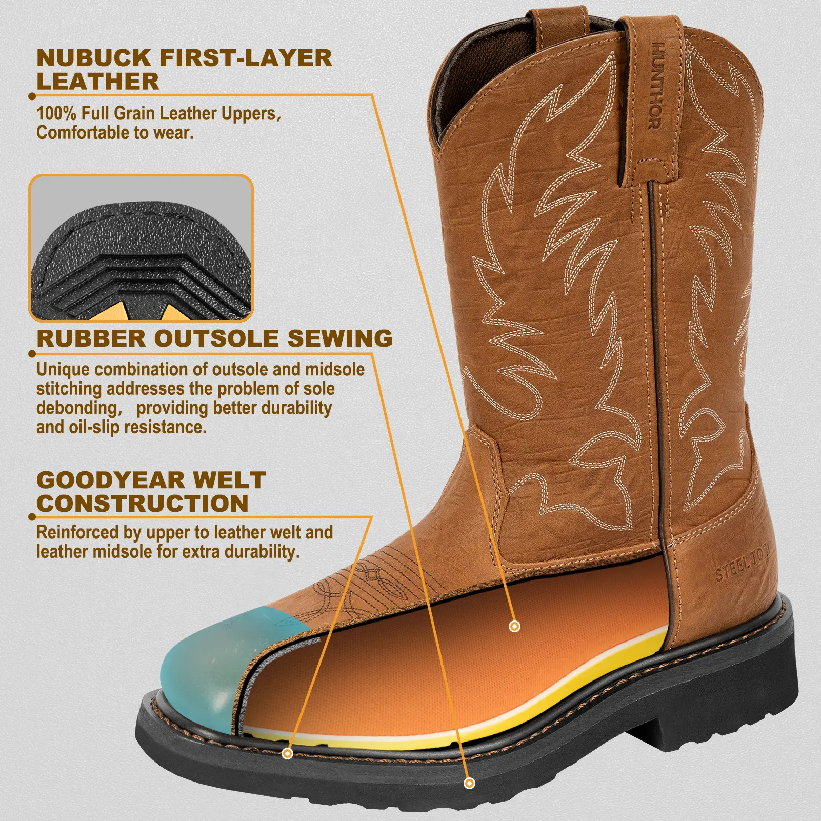 Anti-Slip & Comfort: The rubber anti-slip outsole and EVA footbed in hunthor work boots provide cushioning and support, reducing muscle fatigue and discomfort in feet and legs