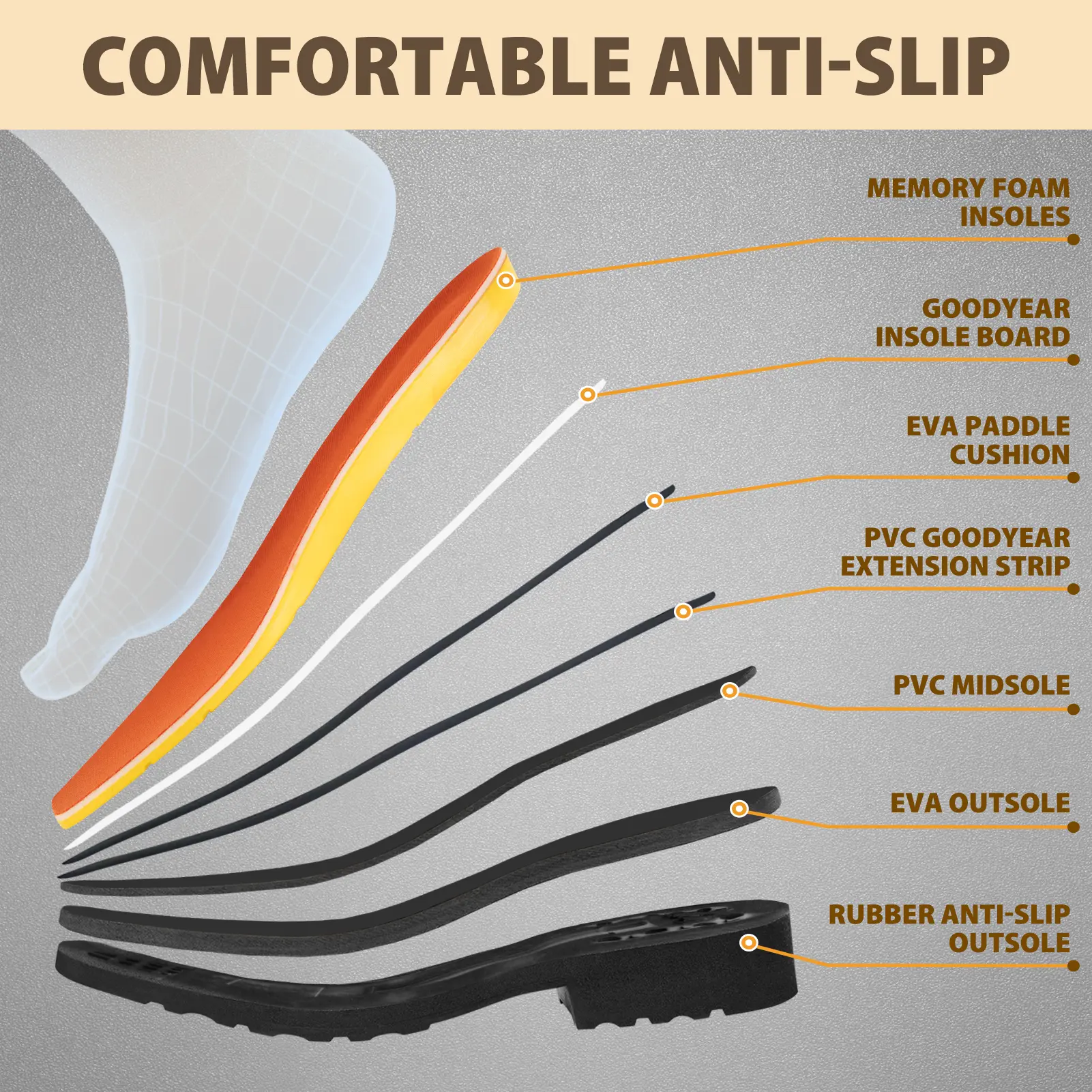 Square Steel Toe: Our steel toe provides standard protection, withstanding large forces from falling or rolling objects.It meets the requirements for different work environments