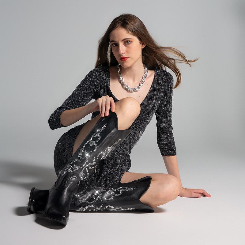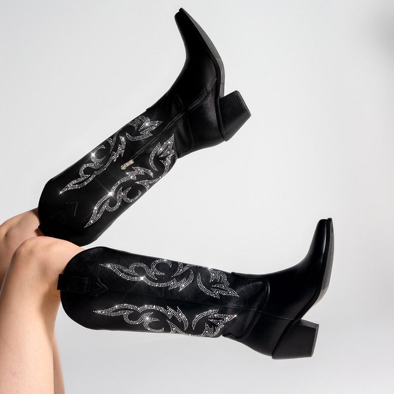 ·[Unique Design Elegance] Platikly black cowboy boots for women elevate your style game. Our innovative take on the knee-high cowboy boot features a mesmerizing combination of sparkly diamonds and a bold silhouette, radiating confidence and allure that's suitable for ladies seeking a unique fashion statement.