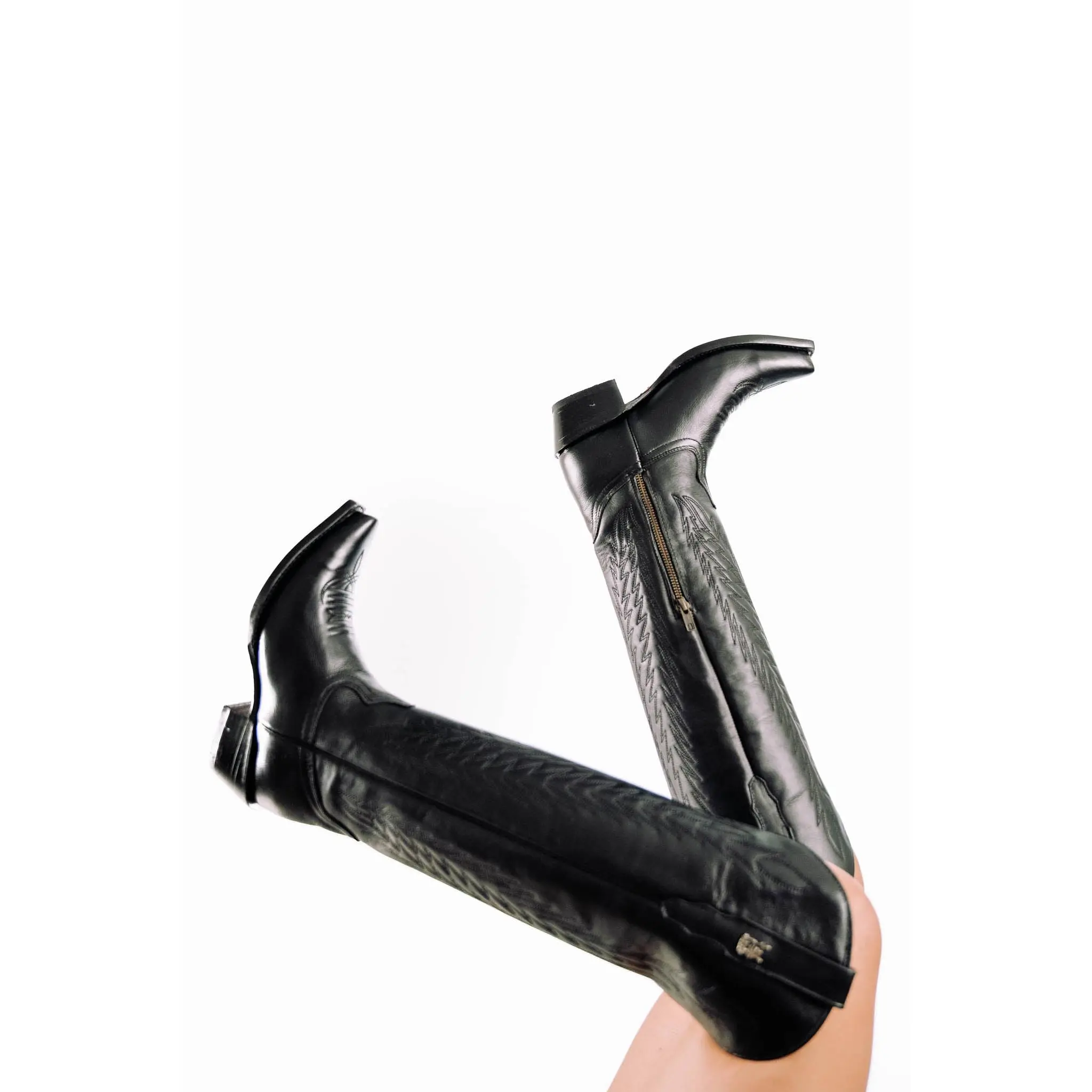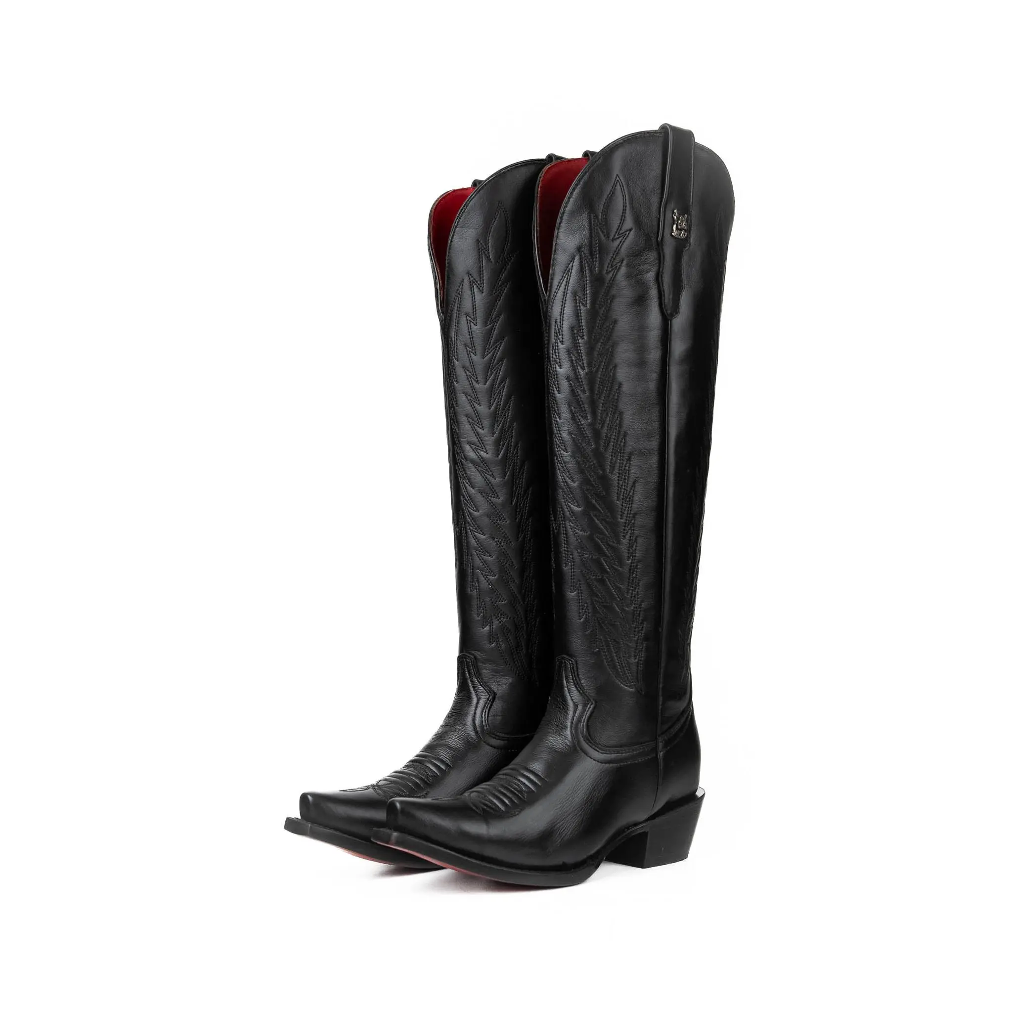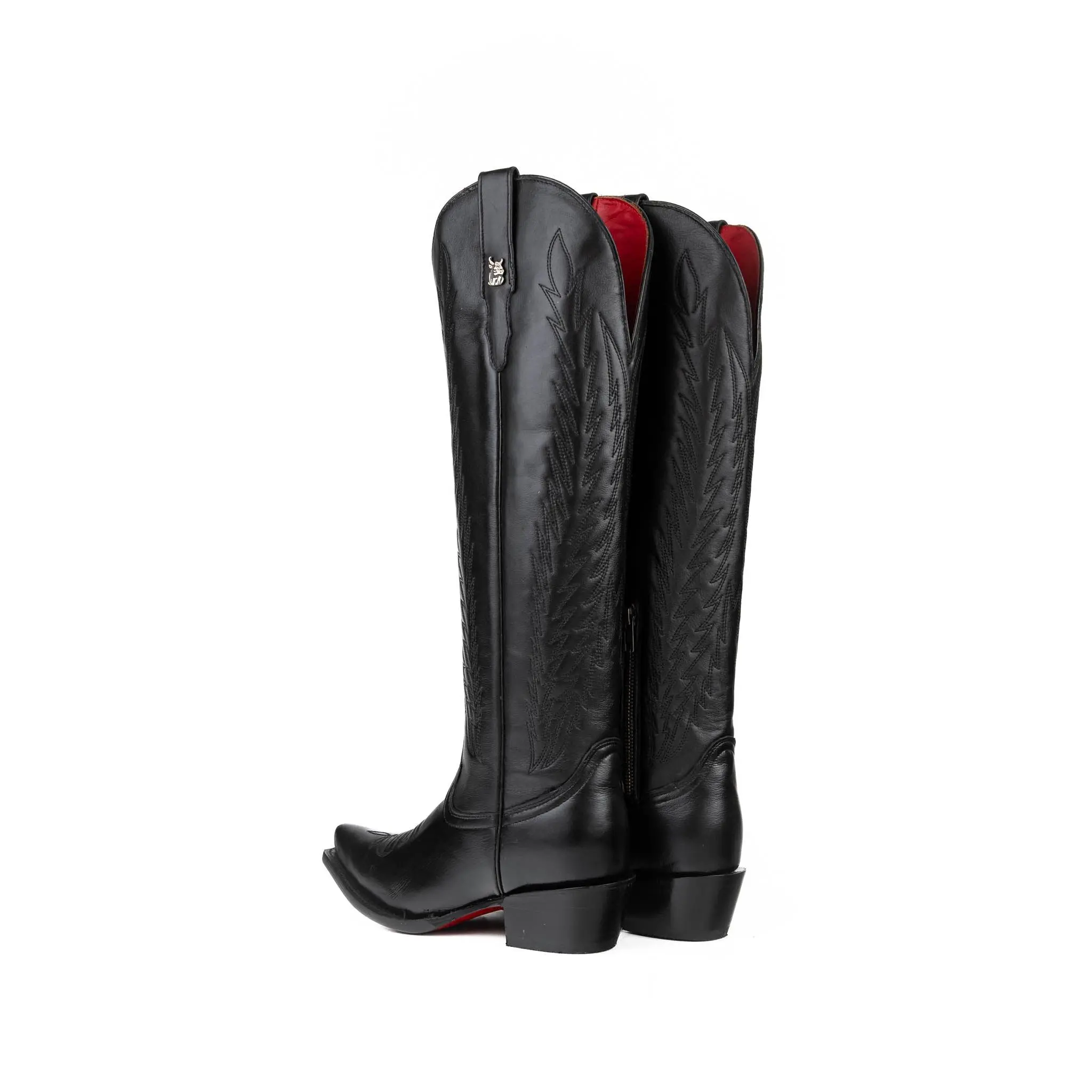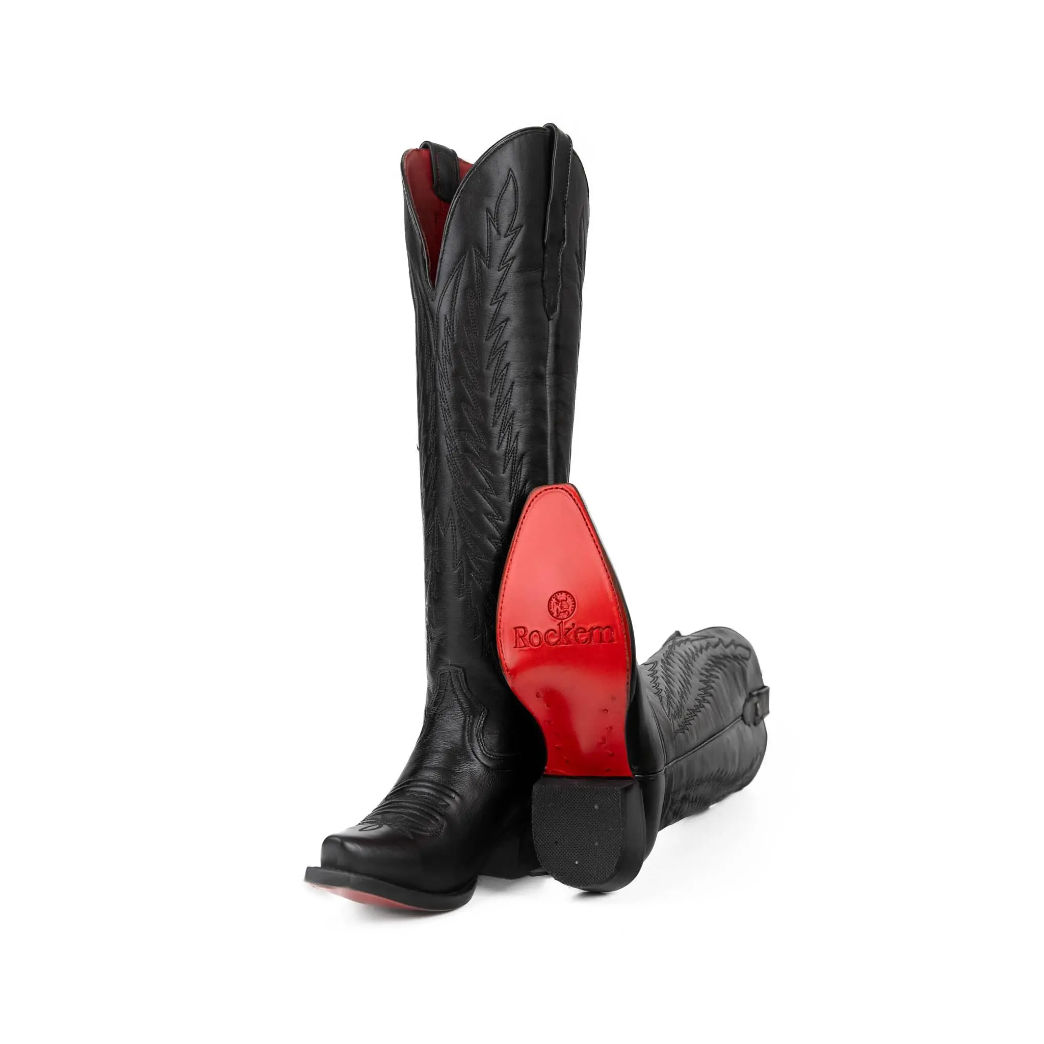 Step into elegance with the Valentina Tall Red Bottom Snip Toe Cowgirl Boot – a captivating blend of classic Western style and bold sophistication. Expertly handcrafted in Mexico from genuine leather, this all-black boot features a tall silhouette with intricate stitching and refined detailing that exudes confidence. The snip toe design, leather sole, and stacked heel offer timeless cowgirl structure, while the striking red bottom adds an unexpected edge. Whether you're headed to a night out, a rodeo, or a special event, the Valentina boot brings the perfect mix of elegance and attitude with every step.