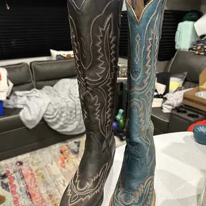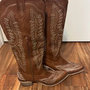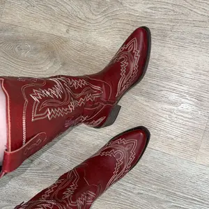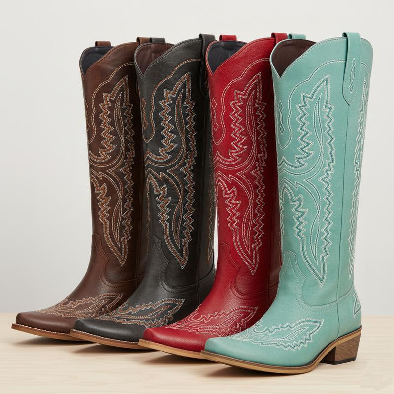 These cowboy boots combine rugged durability with stylish flair. Perfect for town or trails, they make a statement. Available in four colors: black, brown, red, and turquoise. Each pair features hand-stitched detailing reflecting Western tradition. Crafted from premium PU with a durable wooden heel, these boots offer superior comfort.