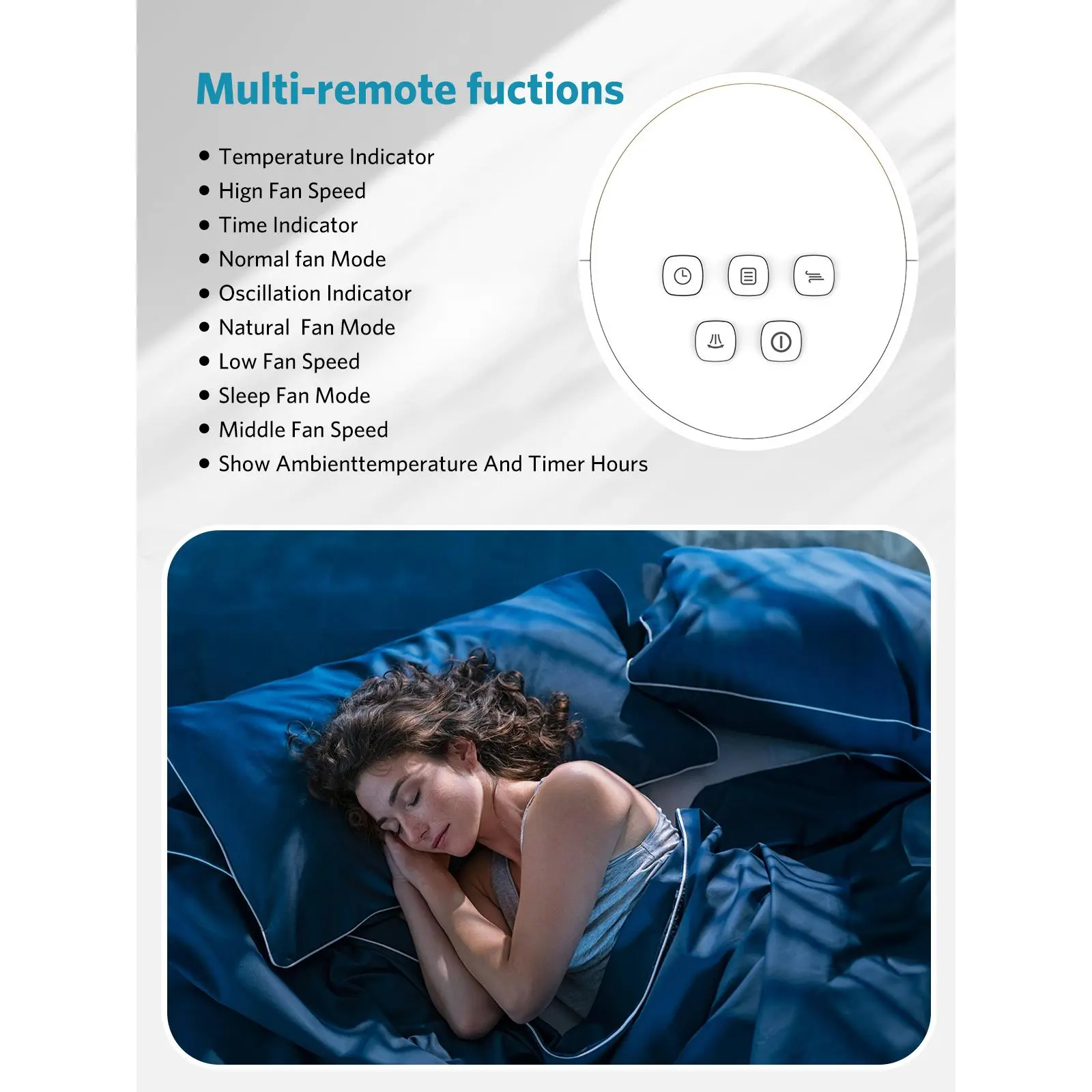 ·Different Wind modes and Speeds: 3 wind modes, normal wind mode,natural wind mode and sleep wind mode. The sleepy mode will reduce 1 wind level in every single half an hour. And keep wind speed level until it turns off. 3 wind speeds,12 hours timer settings for different conditions.