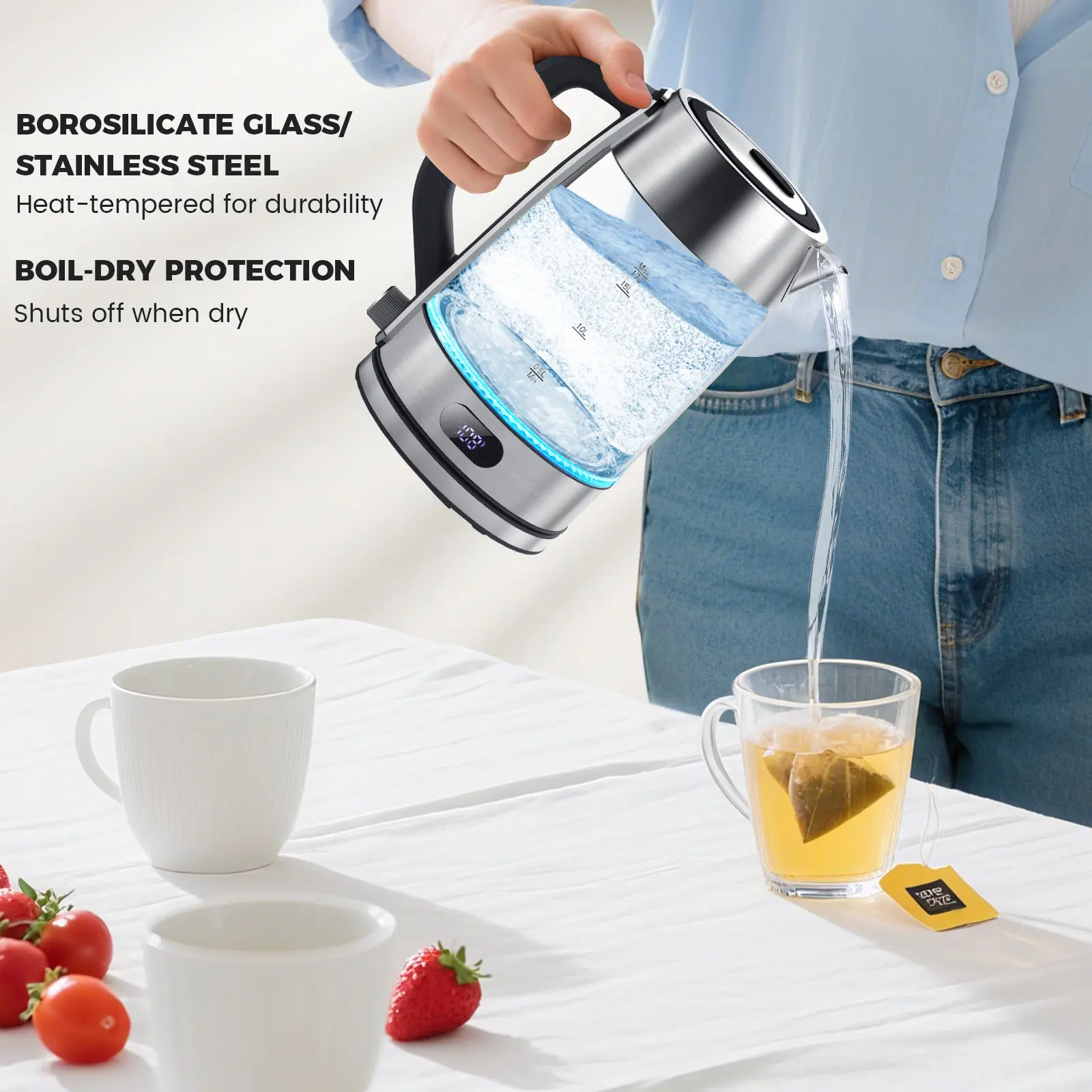 Auto Shut-Off & Boil-Dry Protection: Built-in safety features automatically turn off the kettle when the water reaches boiling or if the water level is too low, preventing overheating or dry burning.