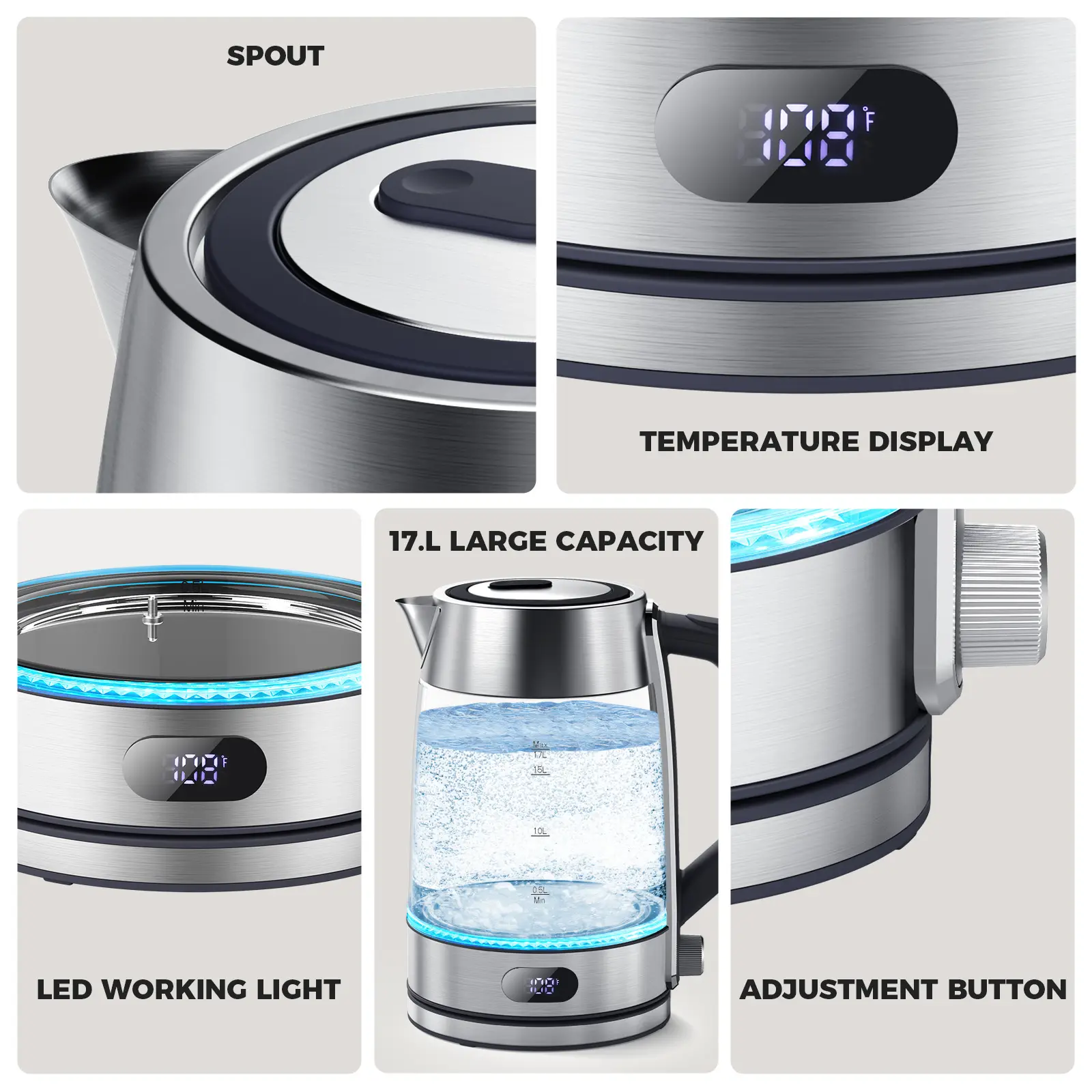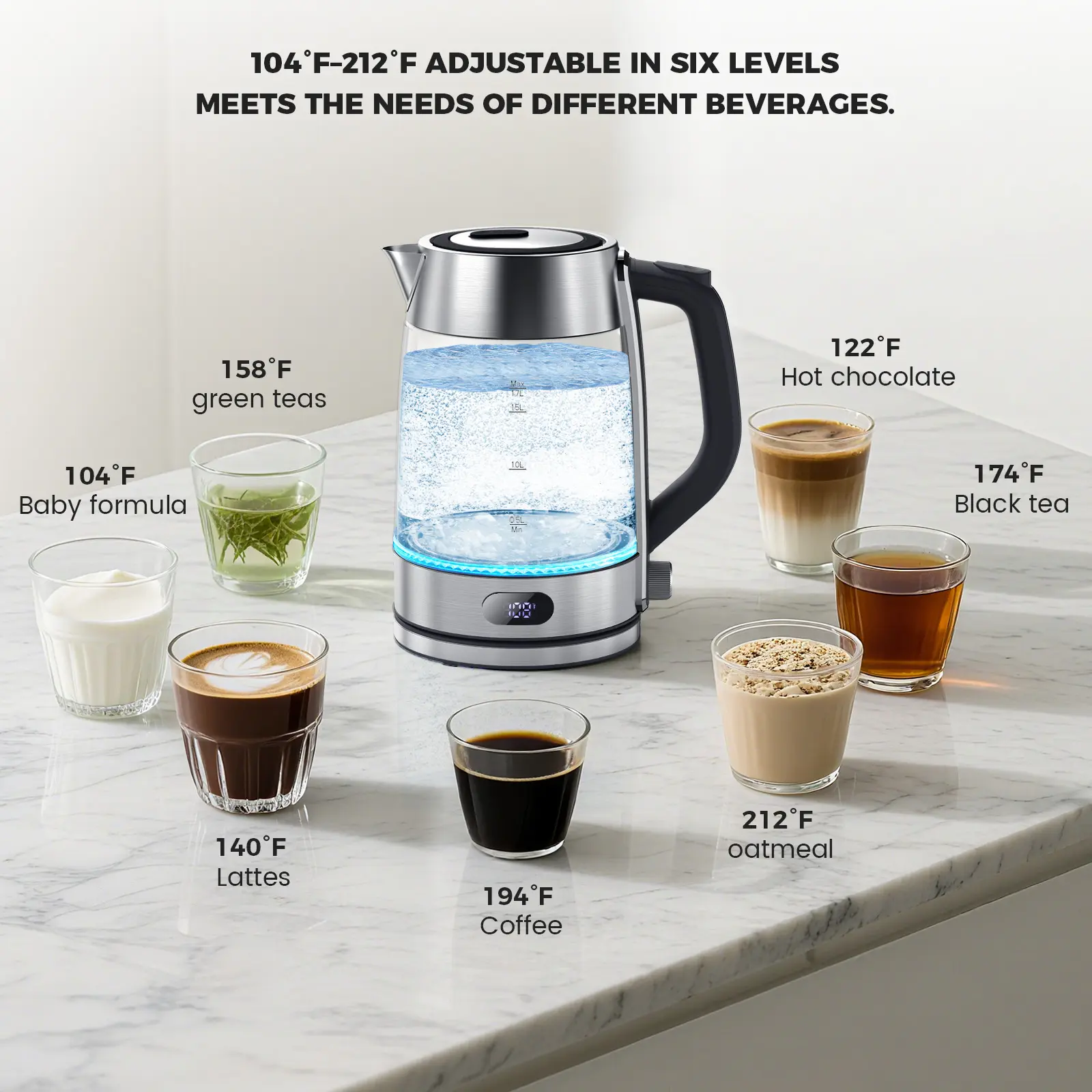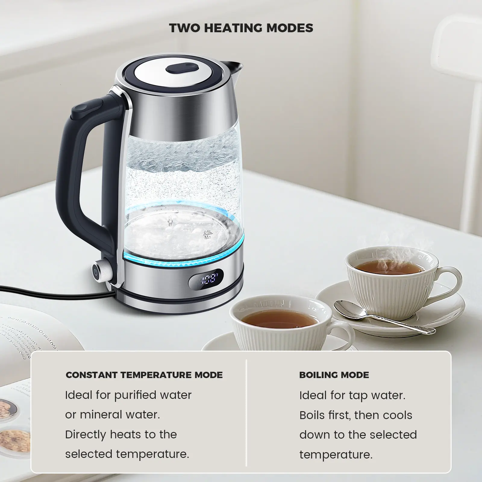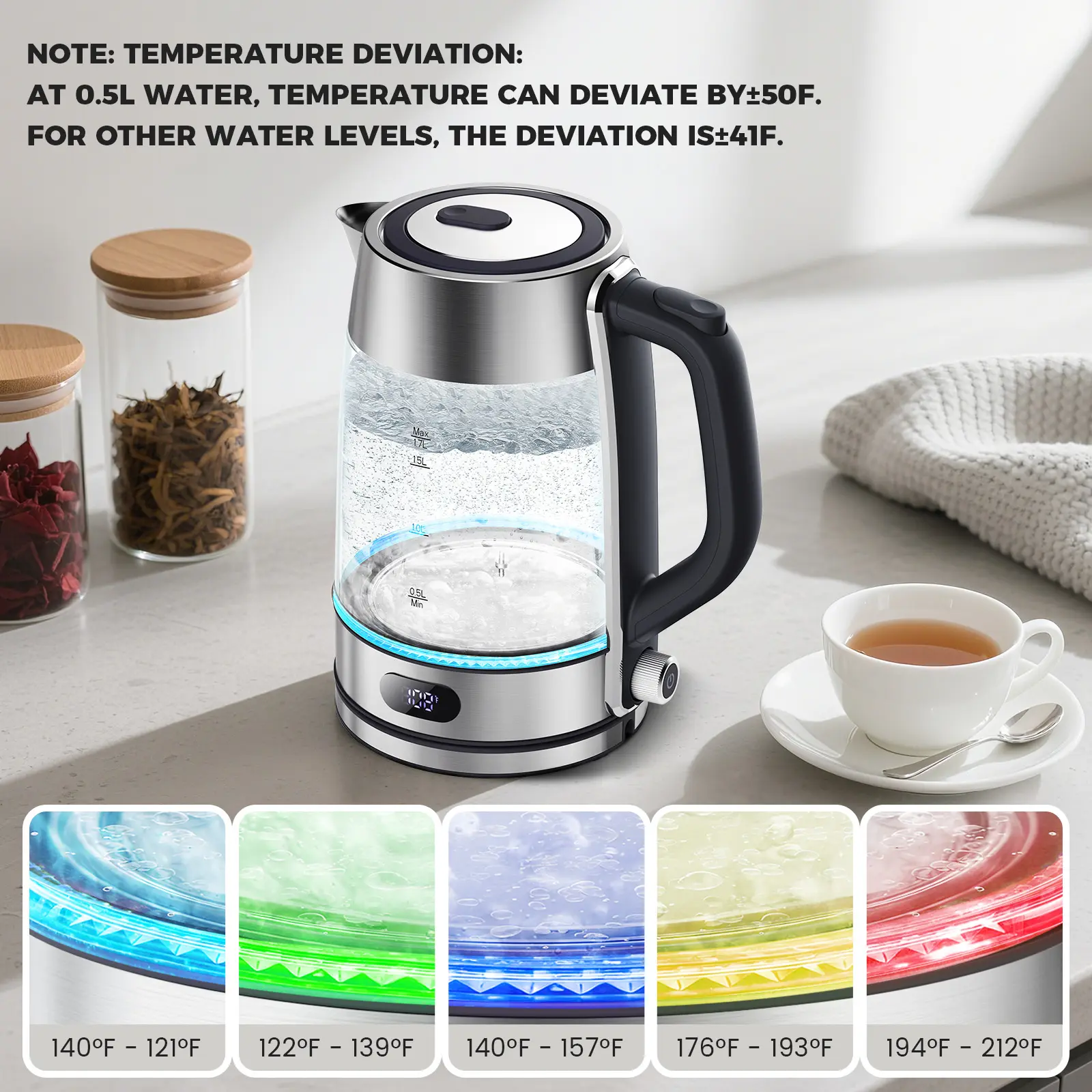 LED Temperature Indicator: Color-changing LED lights clearly show different water temperature ranges, letting you know the exact heat level for tea, coffee, or other drinks.