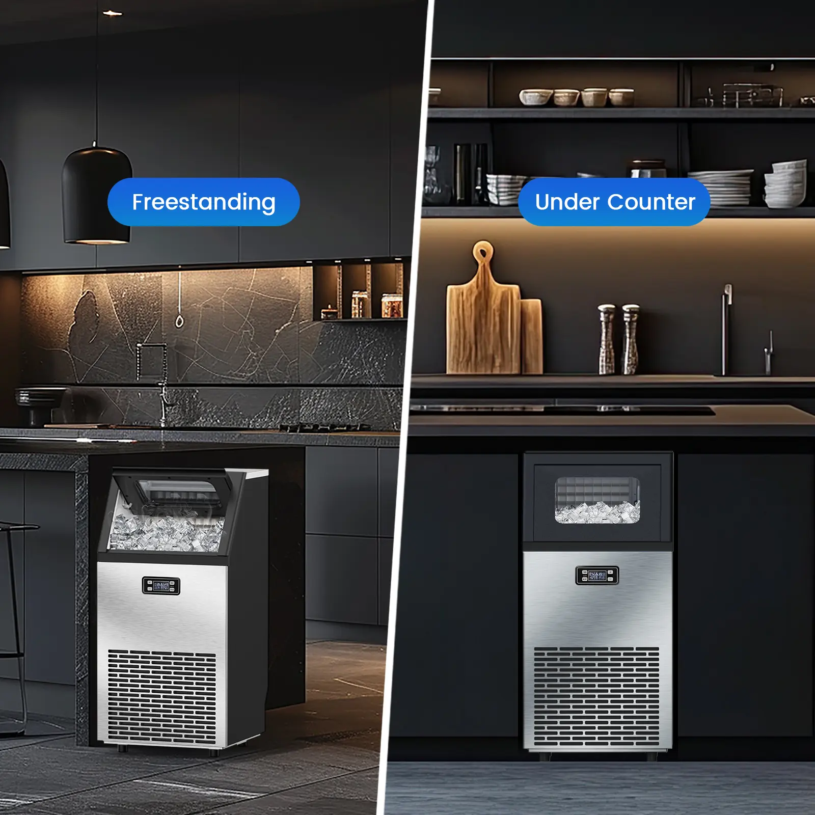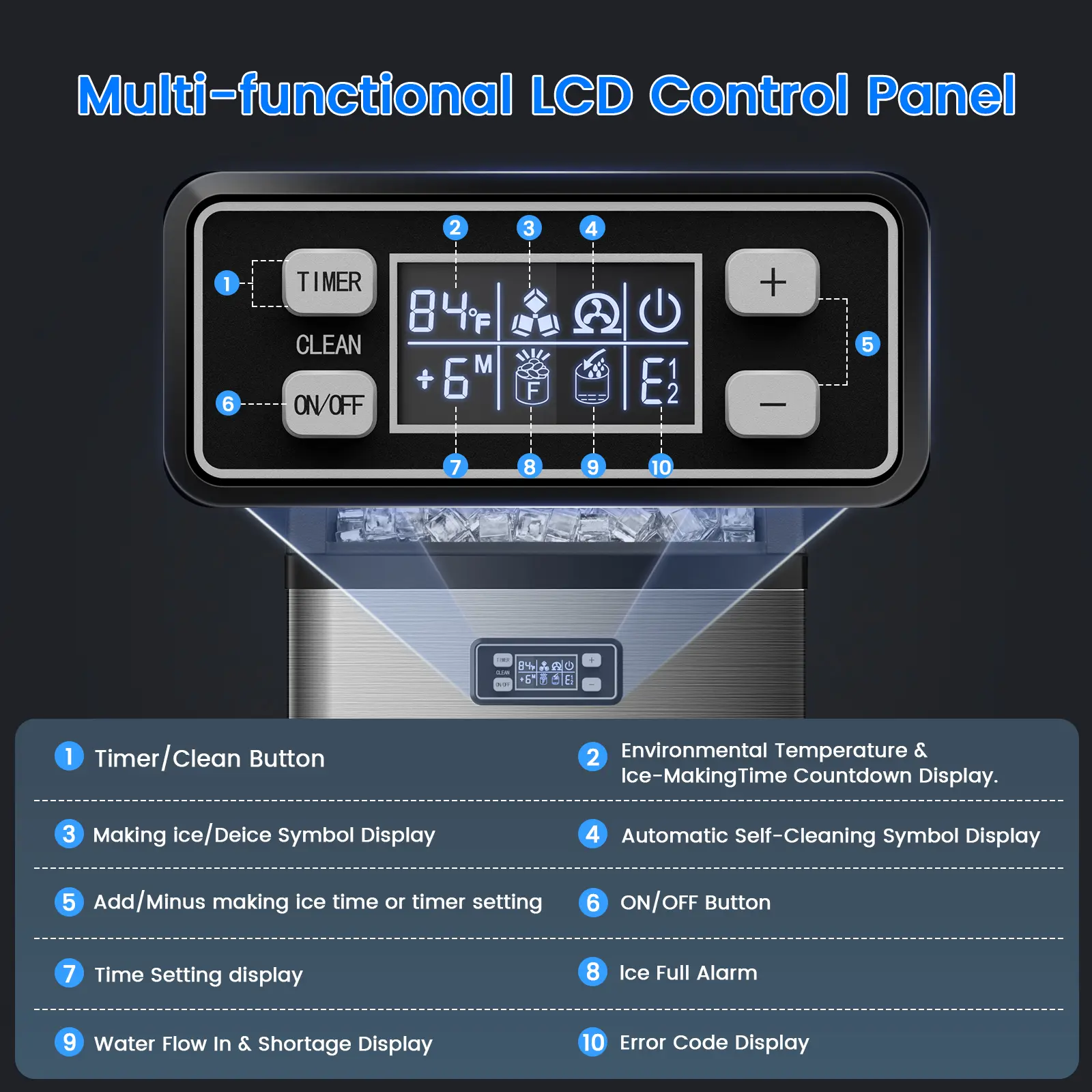 ·The powerful ice maker capacity of 33 pounds a basket of the ice is enough to meet your needs, which is perfect for large cocktail party,home party,office,bar,shop,RV