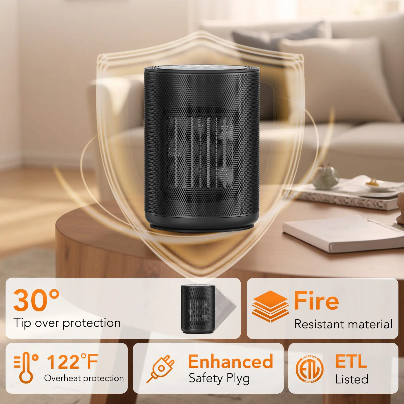 ·【Advanced Safety Features】 Rest easy with built-in safety tech. Tip-over protection cuts power instantly if knocked over. Overheat prevention and a child-safe lock make this portable heater ideal for homes with kids or pets. A reliable electric heater for your bedroom, office, or any small space.