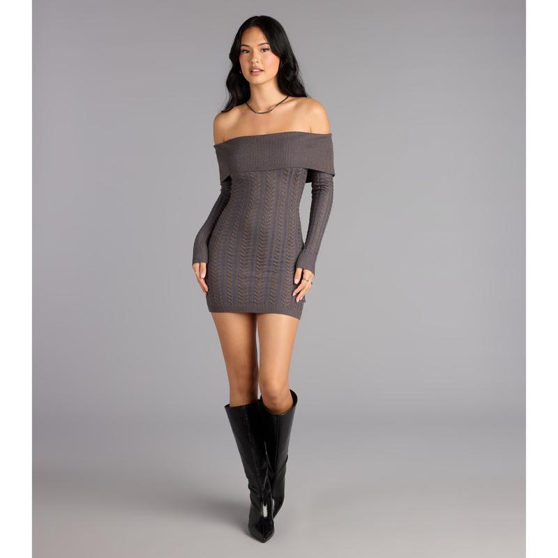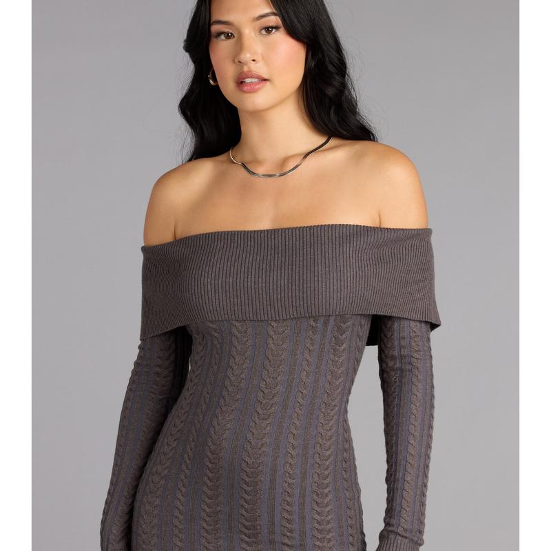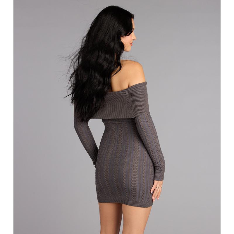 Chic meets snuggly. This off-the-shoulder sweater dress hugs your curves with cable-knit texture while keeping things flirty and polished—perfect for autumn plans, latte runs, or cozy dinners out.