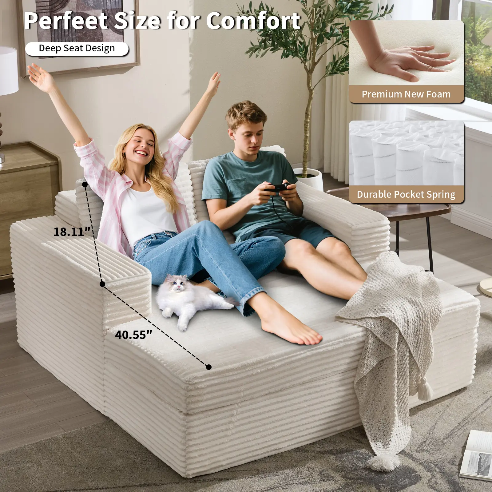 Literally amazing most comfy couch! My husband and I both fit and we are both 270lbs. It holds both our weight and doesn't feel like its sinking or collapsing. So easy to set up
