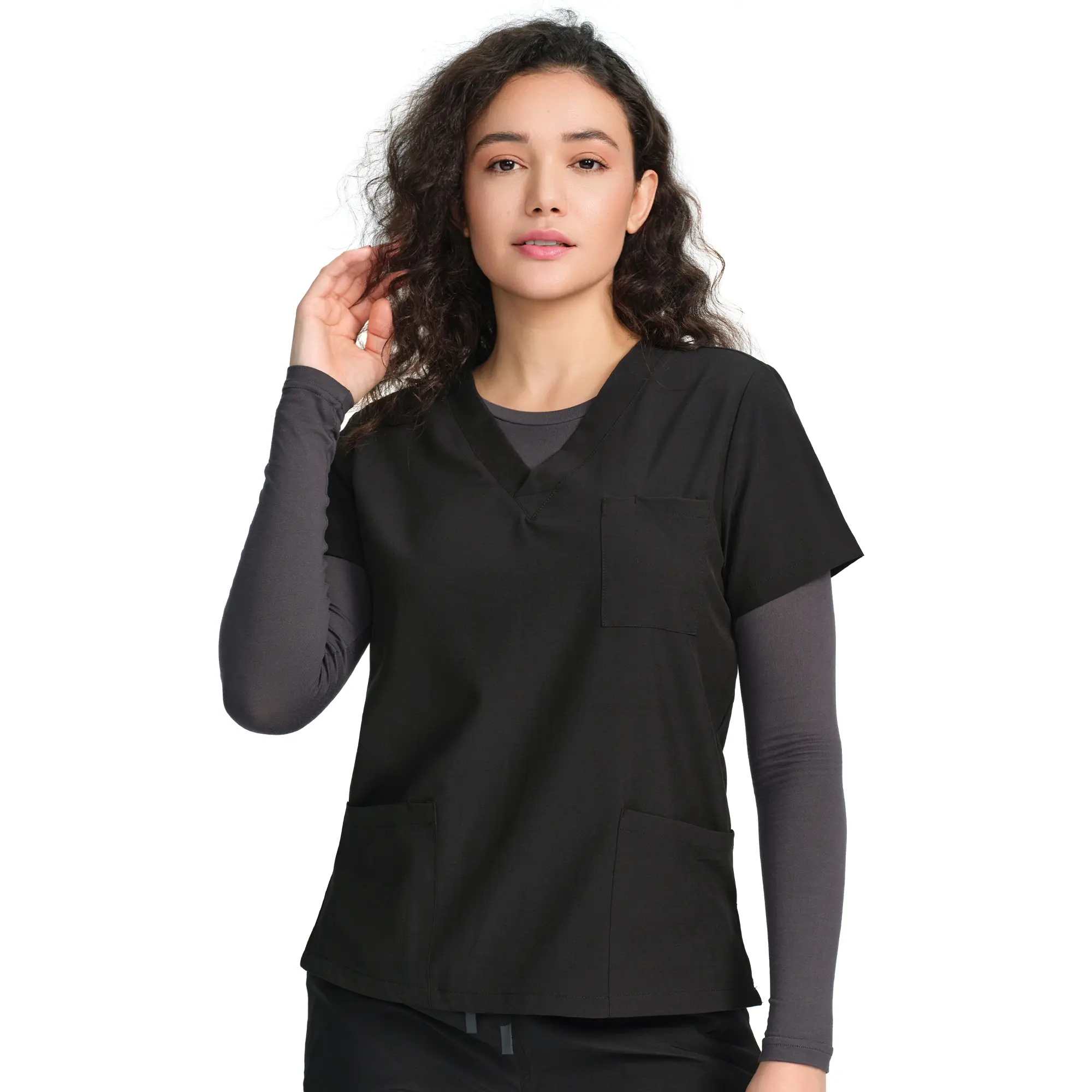 ·Minimalist Crew Neck: The rounded neckline sits neatly at the collarbone, delivering a clean, polished look that layers easily under scrub tops or jackets
