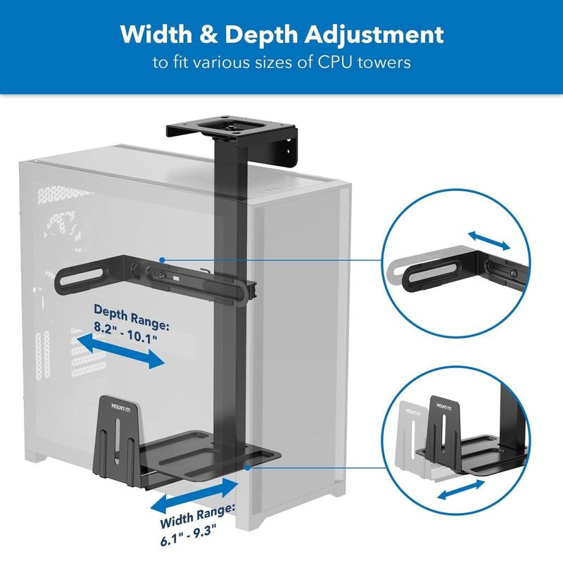 Upgrade your workspace with the Mount-It! Heavy-Duty PC Mount. This versatile mount adapts to various CPU sizes with multi-dimensional adjustment. It can be mounted under the desk or on the wall, saving space and keeping your CPU secure. The 360° swivel allows easy access to ports and cables.