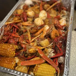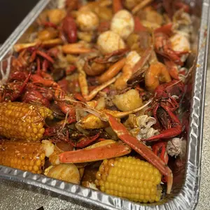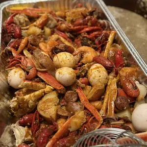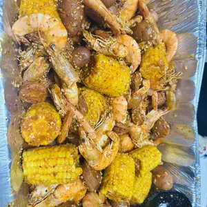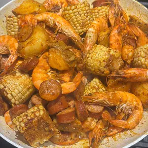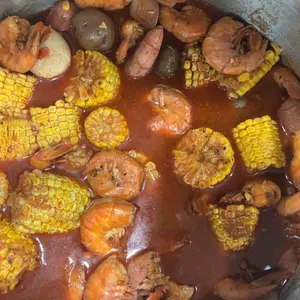 So here in the photo I have 4lbs of shrimp no head, 1 pack of 5 corn on the cob, 1 full sausage link, 1 pack of imitation crab, 8 eggs. I ended up using 1 pack and a half with 5 sticks of butter and extra old bay.
