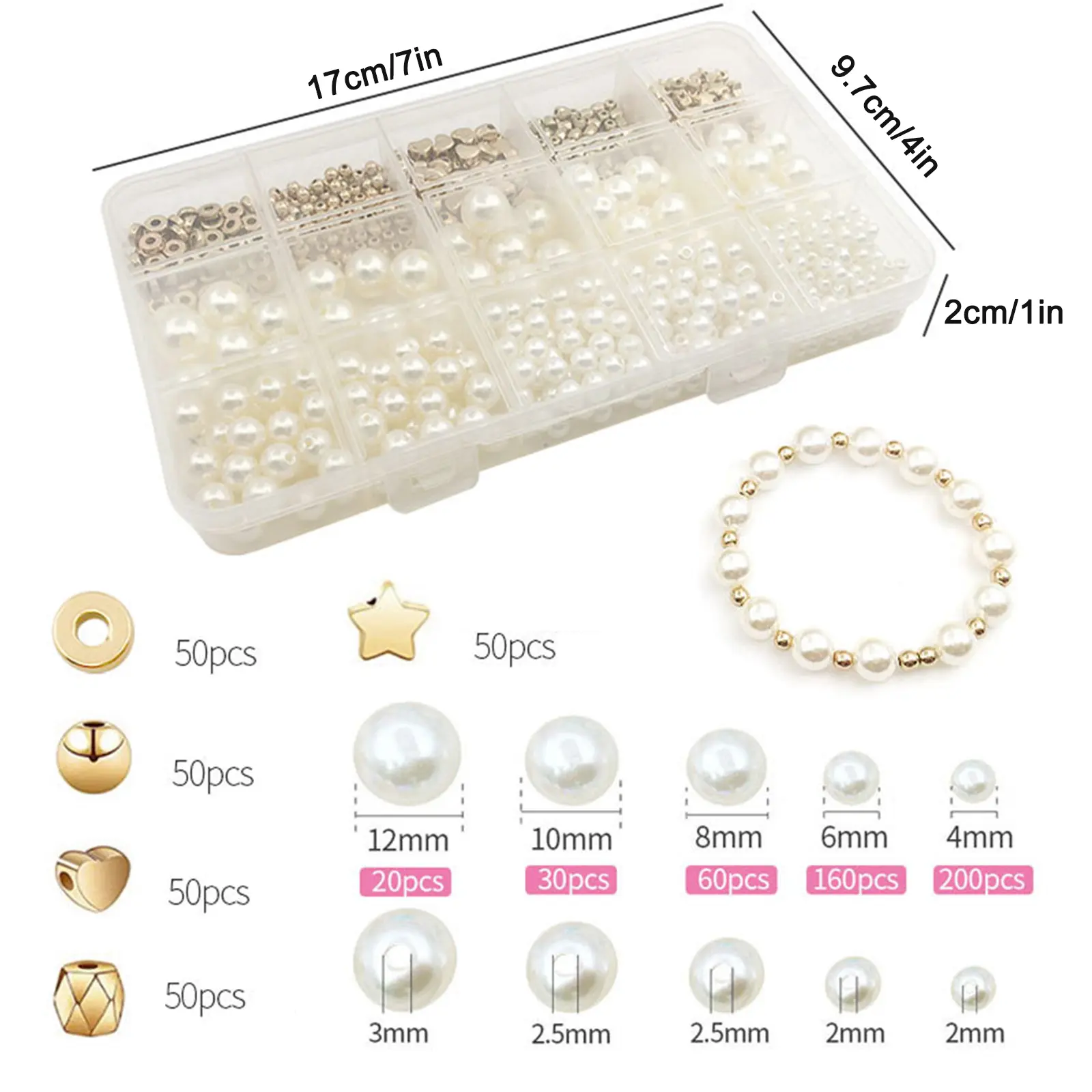 50x Round Flat Beads, 50x Round Beads, 50x Love Beads, 50x Drum Section, 50x Star Orb, 20x12mm Pearl, 30x 10mm Pearl, 60x 8mm Pearl, 160x 6mm Pearl, 200x 4mm Pearl.
