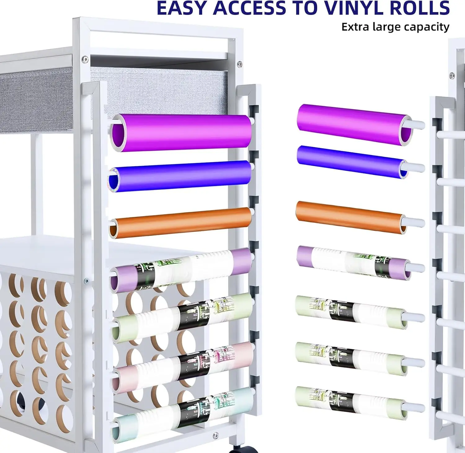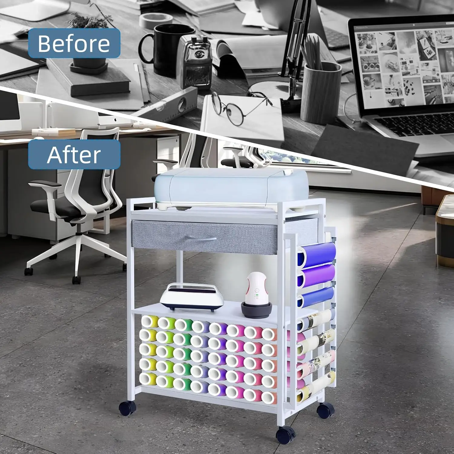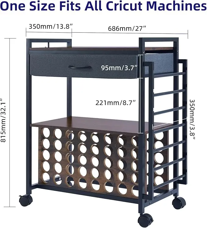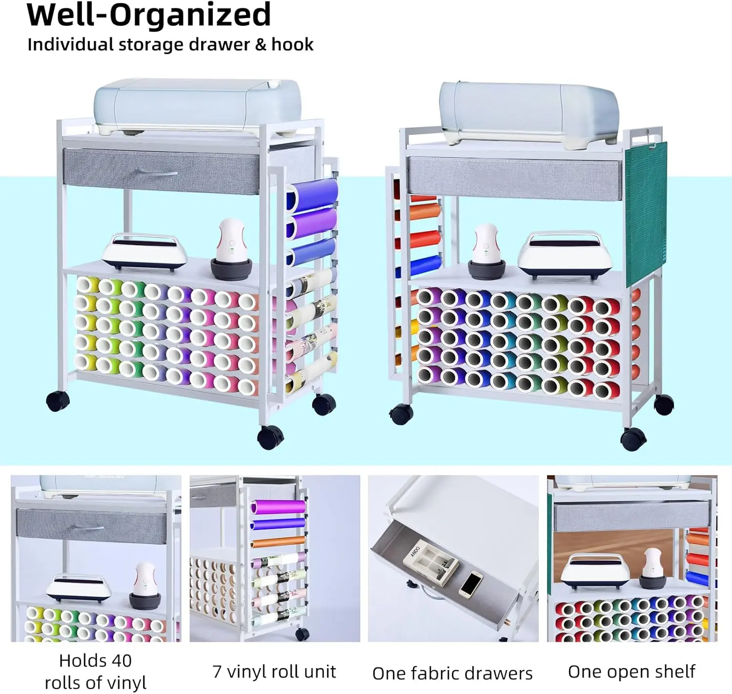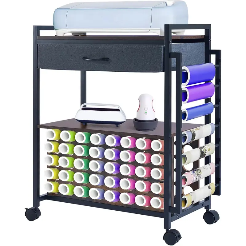 ·【Space-Saving Design】--The craft cart organizes and stores the tools and materials you need. The top shelf can hold a cutting machine, the drawer can store cutter accessories, and the middle shelf is perfect for a heat press. The lower vinyl roll holder can accommodate up to 40 vinyl rolls, and side hanging vinyl roll organizer for 7 vinyl rolls.