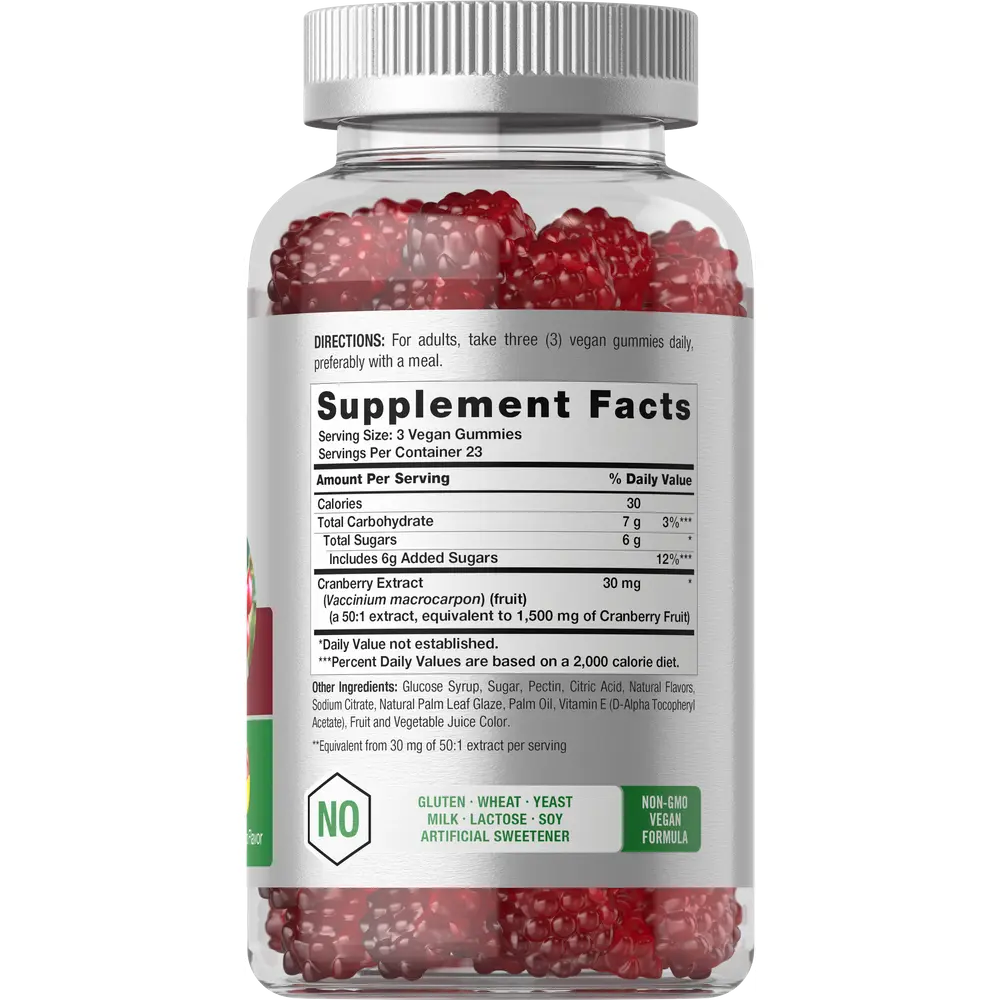 These tasty little gummies are packed with the equivalent of 1,500 mg of Cranberry fruit per serving, and are bursting with delicious Cherry Mango flavor. Our vegan formula is gluten-free and non-GMO, containing no artificial color and only 2g of sugar per serving. It’s the delicious way for adult men & women to enjoy Cranberry every day!
