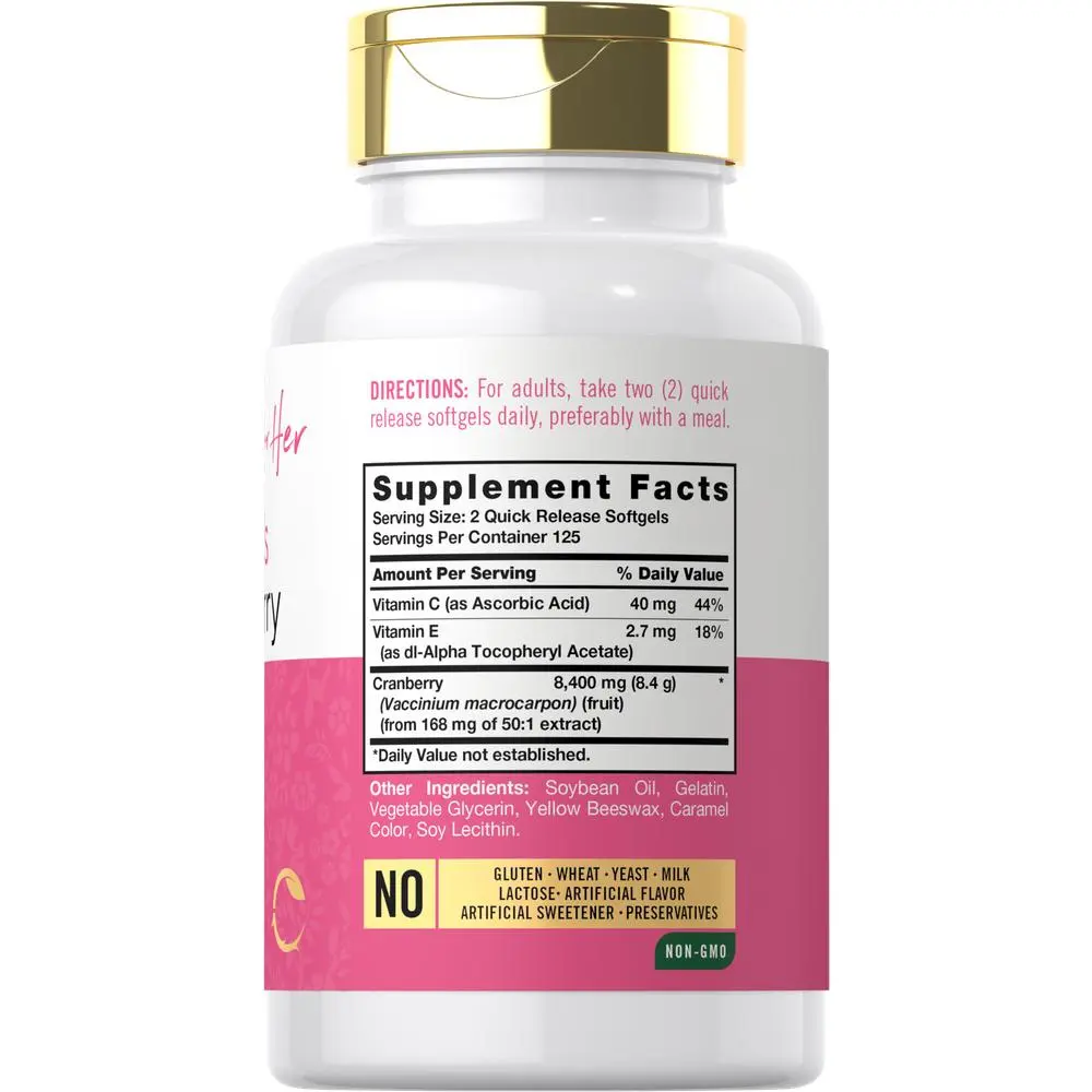 IngredientsVitamin C, Vitamin E, Cranberry. Other Ingredients: Soybean Oil, Gelatin, Vegetable Glycerin, Yellow Beeswax, Caramel Color, Soy Lecithin.