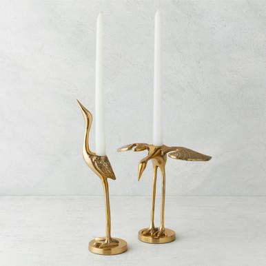 A graceful and elegant addition to any mantel, shelf, or tabletop. These crane taper holders are intricately detailed and finished in gold. Each holds one taper candle (candle not included).