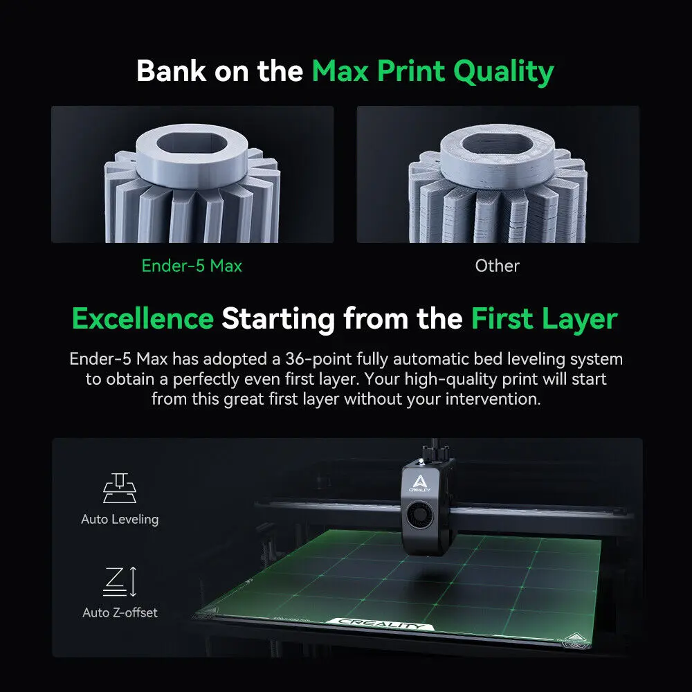 X-axis linear rail + dual Z-axis rods ensure ±0.1mm accuracy. 36-point auto-leveling delivers flawless first layers, ideal for high-detail prints