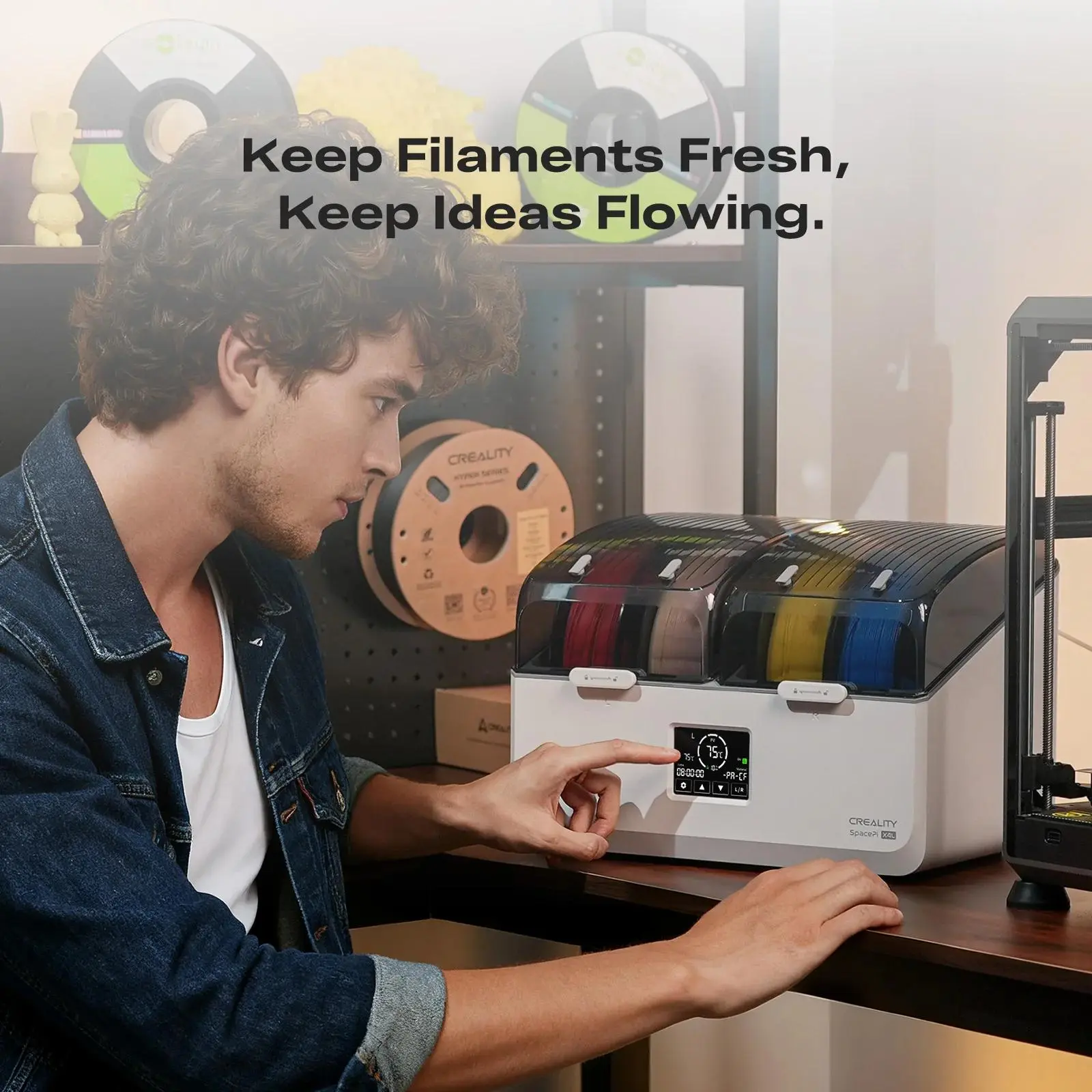 Dry filament. Better prints. If you are fighting stringing, bubbles, weak layers, or inconsistent extrusion, moisture is likely the issue. The Creality SpacePi X4L dries up to four spools at once and reaches 75°C for fast, even heating. Adjustable temperature and timer settings let you match the material you are running. Perfect for PLA, PETG, TPU, nylon, and other moisture-sensitive filaments. A must-have upgrade for consistent, high-quality 3D prints. #tiktokshopcreatorpicks #CreatorPicksAmbassador #TikTokShopStockUp #3DPrinting #tiktokshopspotlightfinds