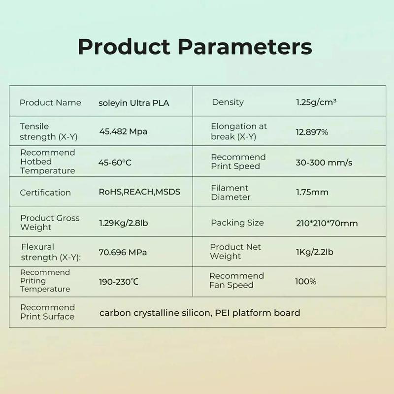 ·Dimensional Accuracy & Consistency: 1kg spool (2.2lbs) Ultra PLA filament, 1.75mm diameter with ±0.02mm minimum tolerance.