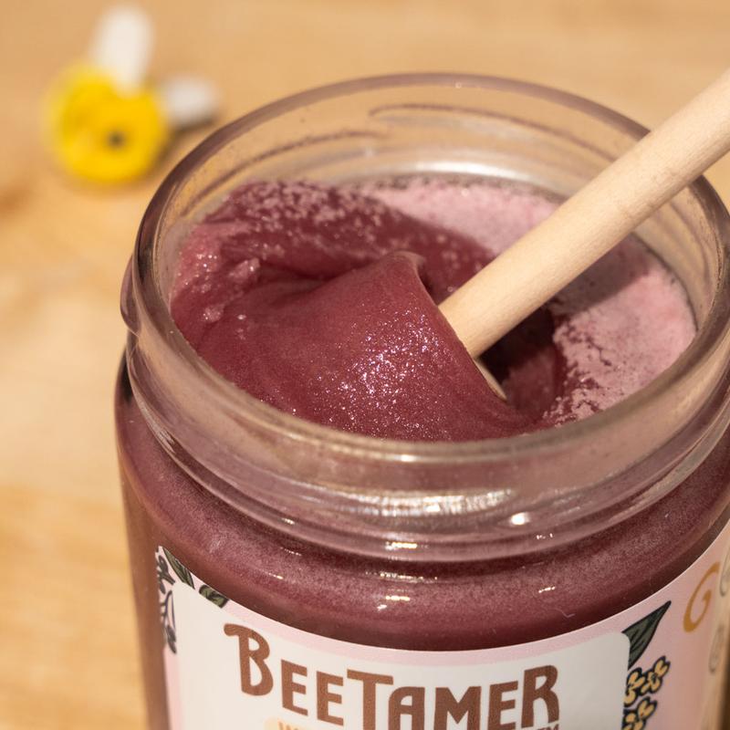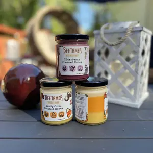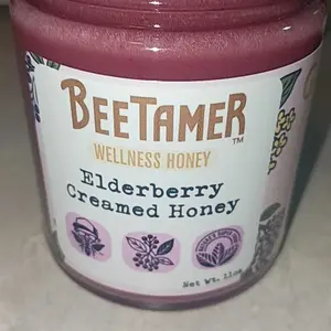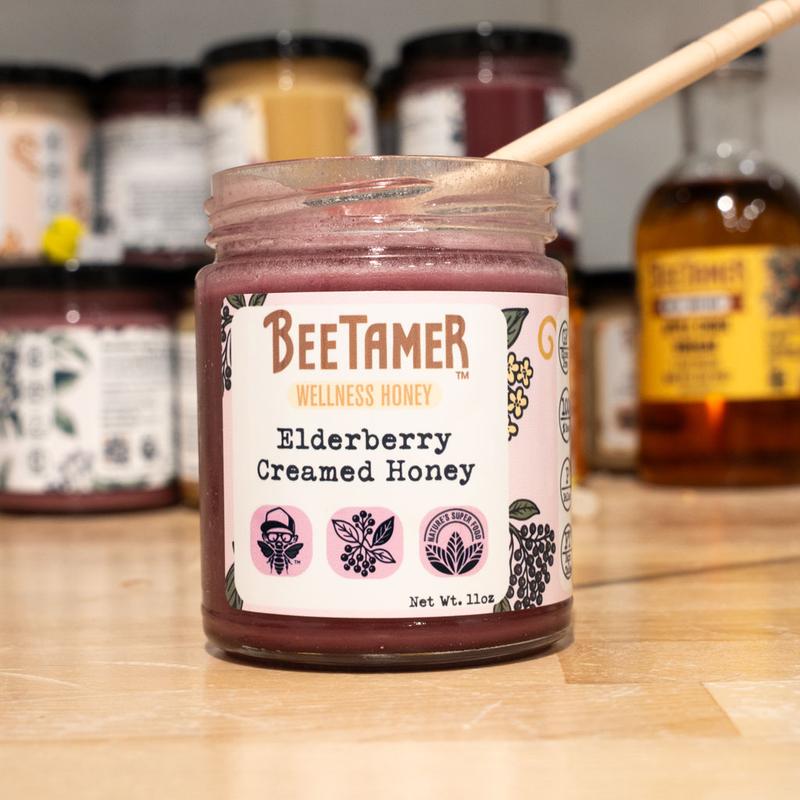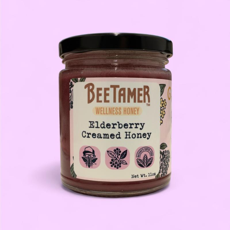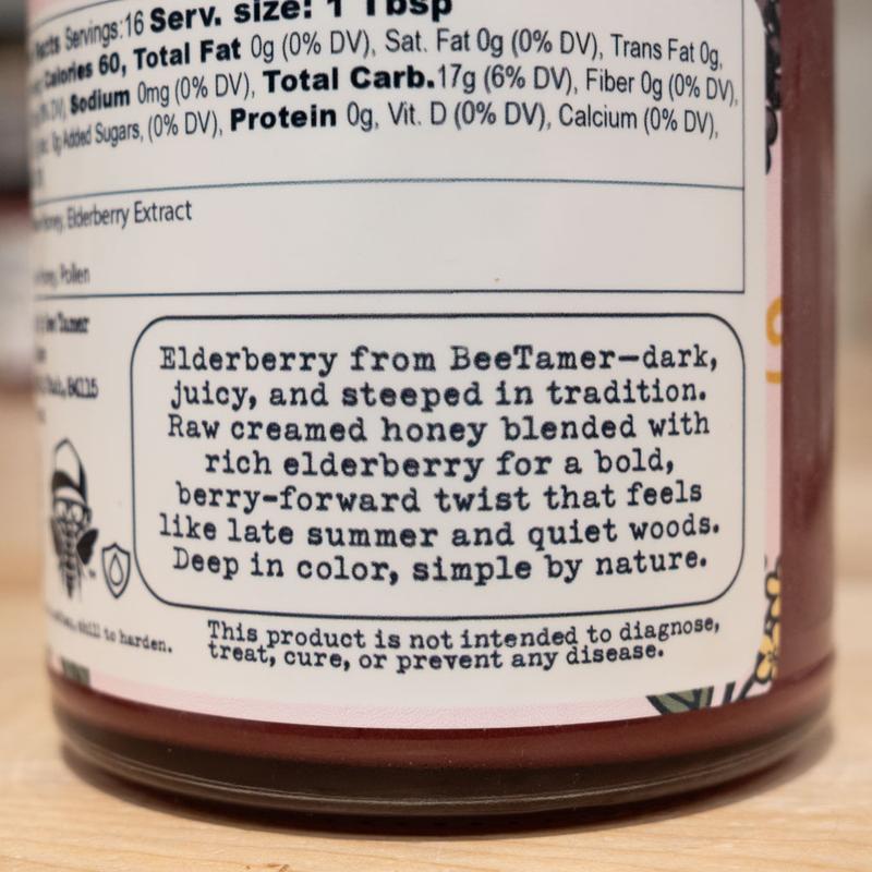 BeeTamer Elderberry Creamed Honey is smooth, fruity, and perfectly balanced. The tart elderberry adds a bright twist to sweet honey—amazing in tea, on toast, or by the spoonful.